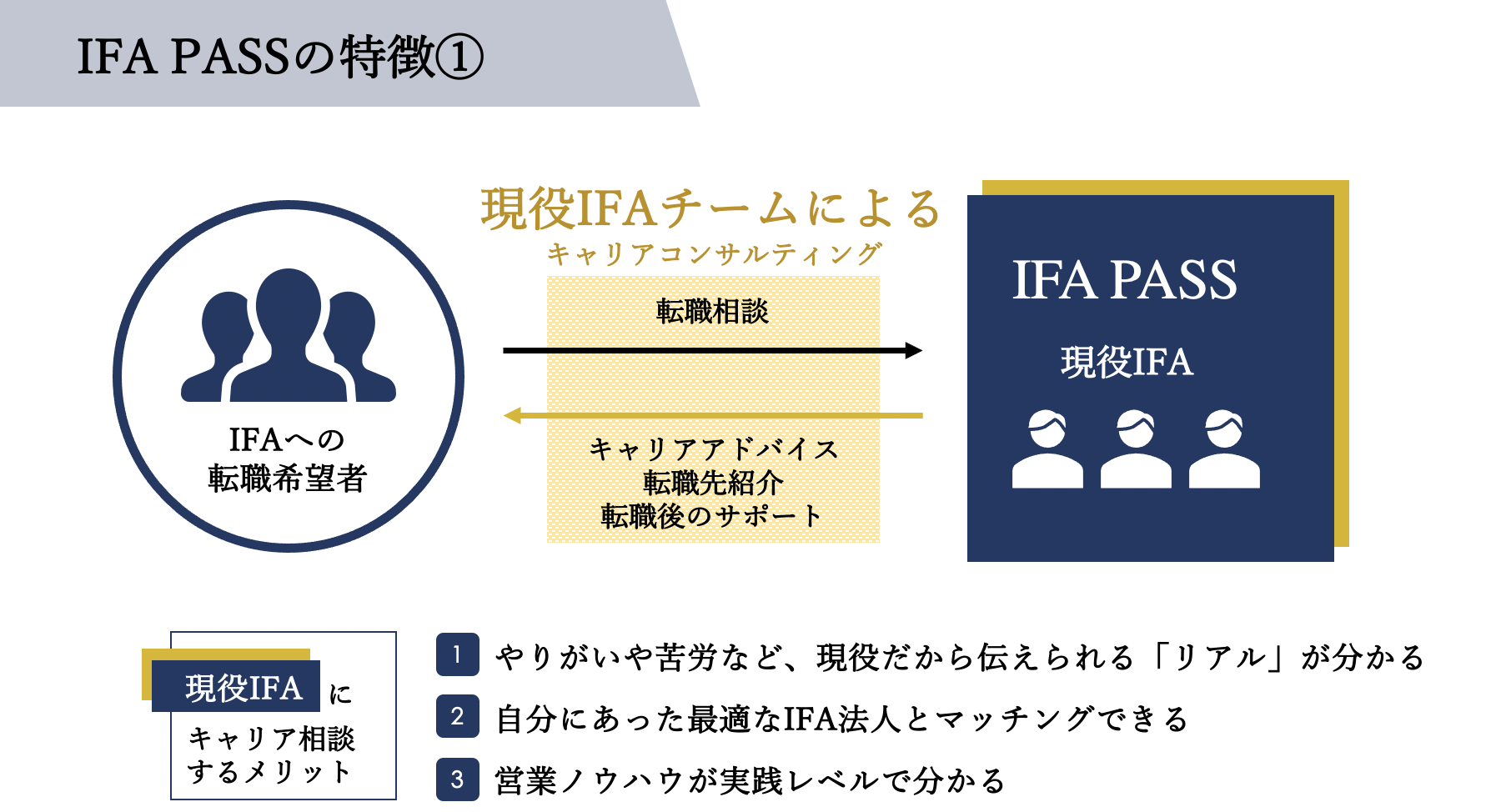 IFA実務をもっともよく知る現役IFAチームがキャリアアドバイザーを務めることで、IFAの良さも苦労も経験上共有できるため、情報の非透明性の解消に貢献できると考えています。
