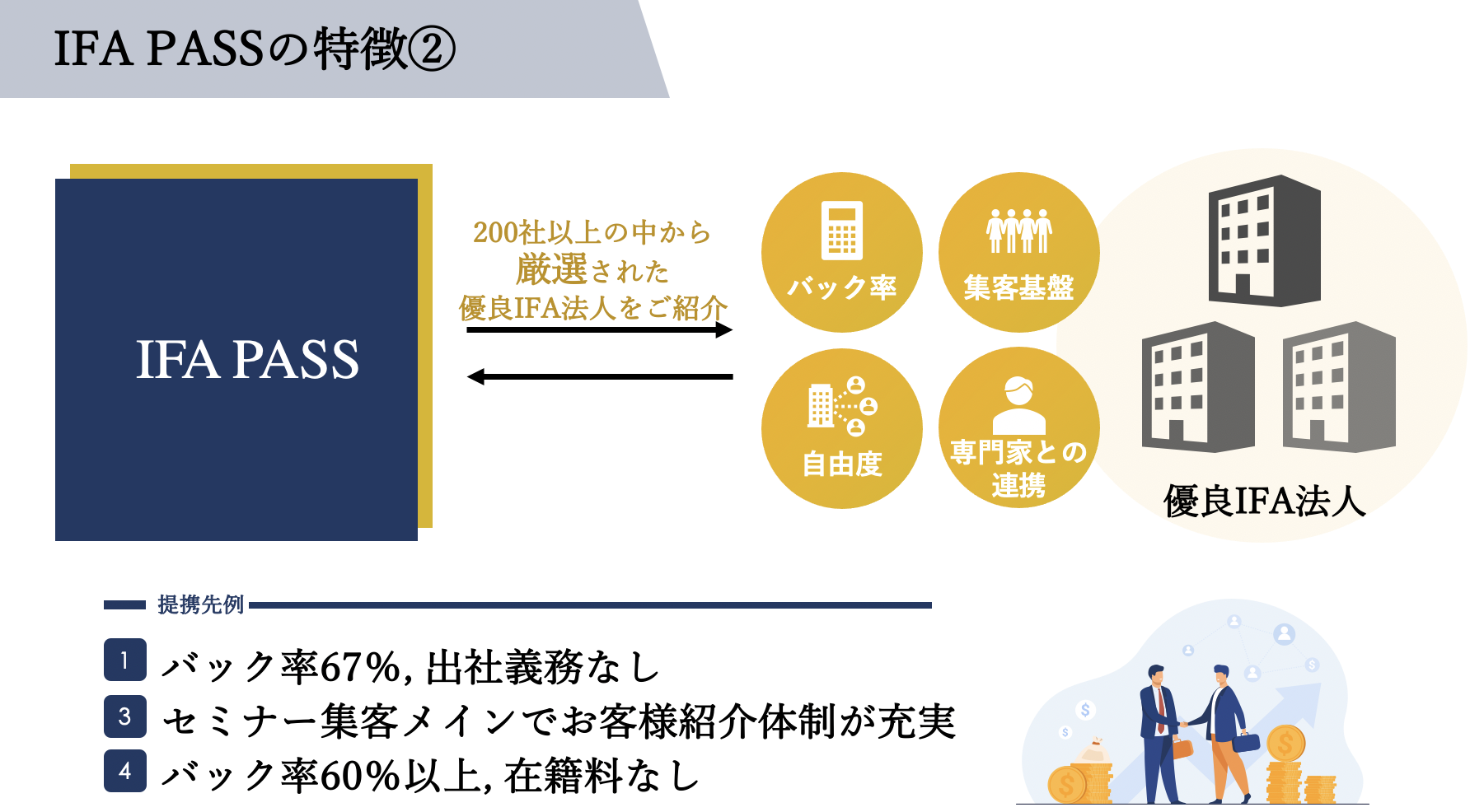 IFA転職サービス、資産形成メディア、資産運用業特化型WEBマーケティング支援を展開している株式会社LIONELは、IFA転職サービスである「IFA PASS」のサービス内容を拡張いたします。相談者様は、「IFA PASS」を通じて、IFAキャリア相談だけでなく、転職後に運営メディアや提携顧客マッチングツールからの集客支援に加えて、富裕層に強い税理士や法人保険のプロフェッショナルなど協業先の紹介を受けることができます。