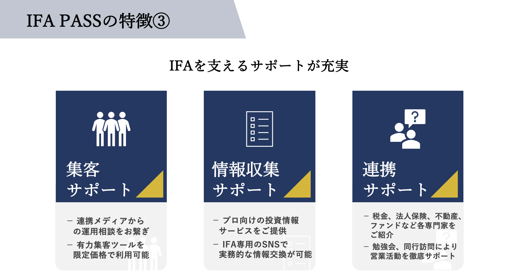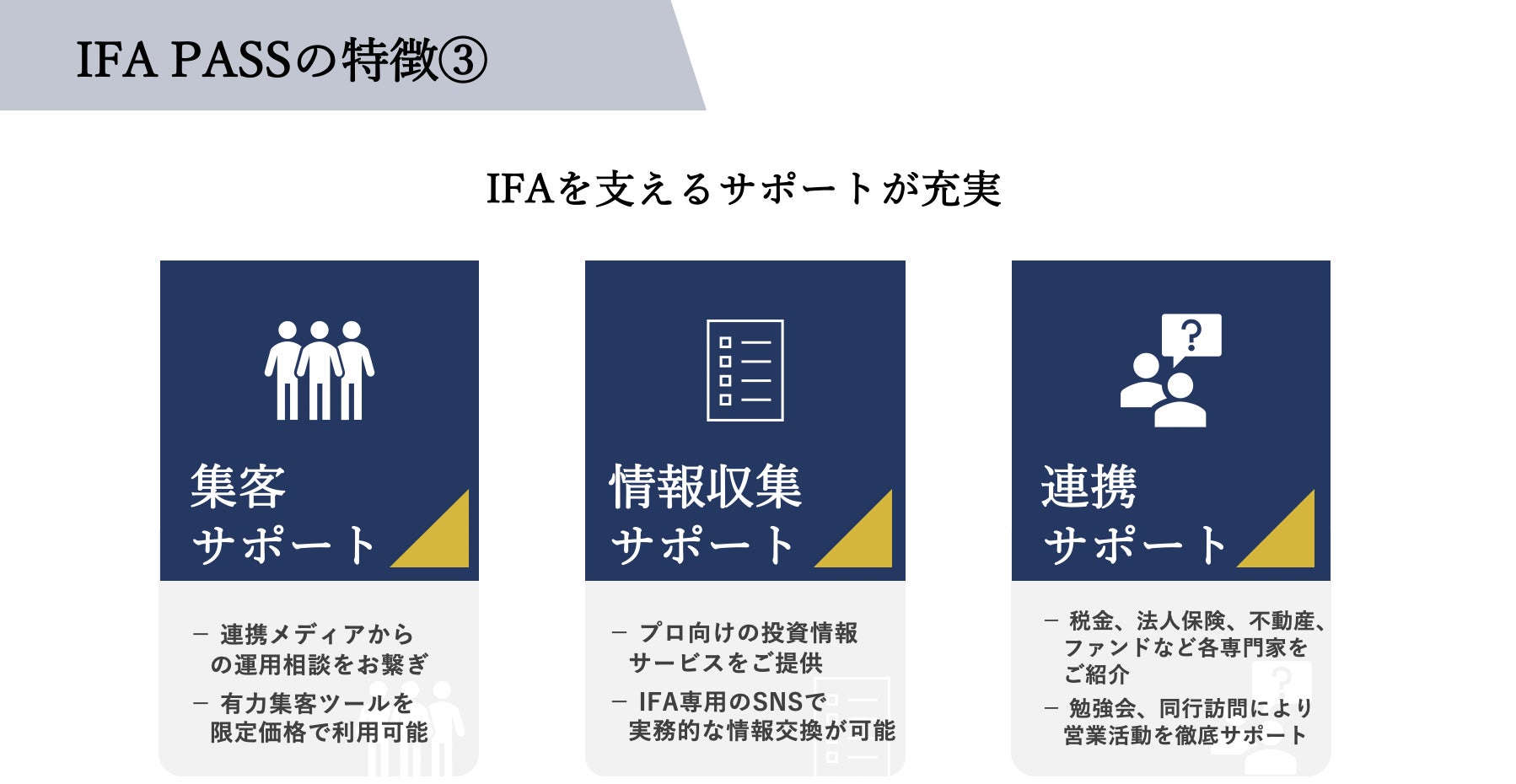 この度のリリースで発表させていただくのは、この3つ目の強みであります。従来のキャリアコンサルティングに加えて、IFAの活動を支えるサポートを充実化。顧客基盤、情報収集基盤、協業基盤という、IFA実務において肝要な3つの基盤を強化できる体制を、弊社独自のメディア戦略とアライアンス戦略によって実現いたしました。