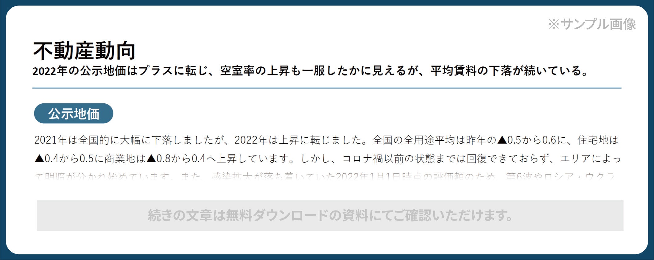 賃料動向レポートでは触れていない、業界が独自に抱える課題や、直近のトピックスなどを盛り込み、賃料動向レポートと併せ読むことで、業界の動向と賃料との相関関係が分かりやすくなります。