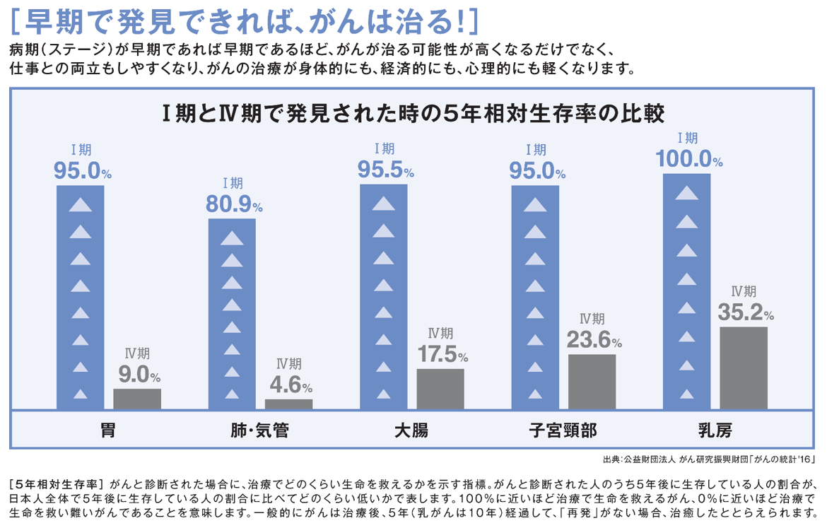 常々言われていることですが、がんは早期発見が重要で治療の効果を左右します。早期発見できたときとできなかったときの生存率は、5倍以上変わってくるものもあります。