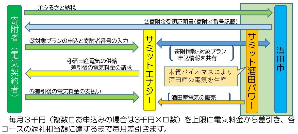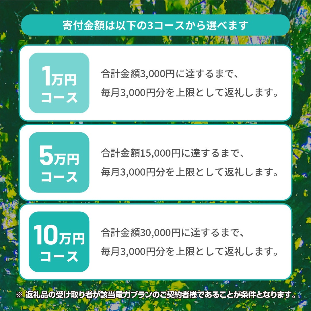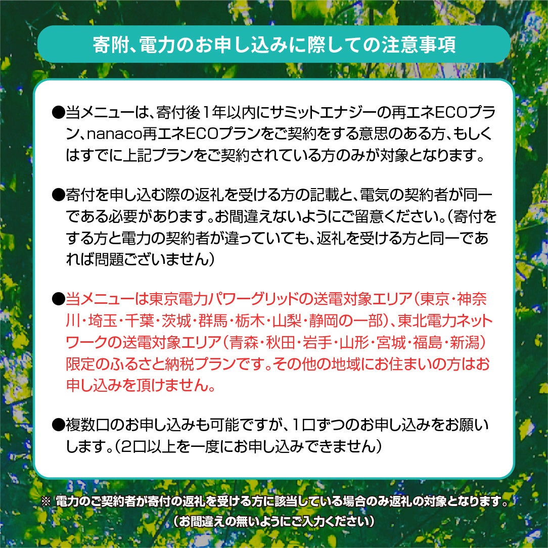 返礼を受けるためには、返礼品提供事業者であるサミットエナジー(株)の対象プランに申込(加入)いただいたうえで、寄附時に割り当てられた寄附者番号をコードとして入力いただく必要があります。