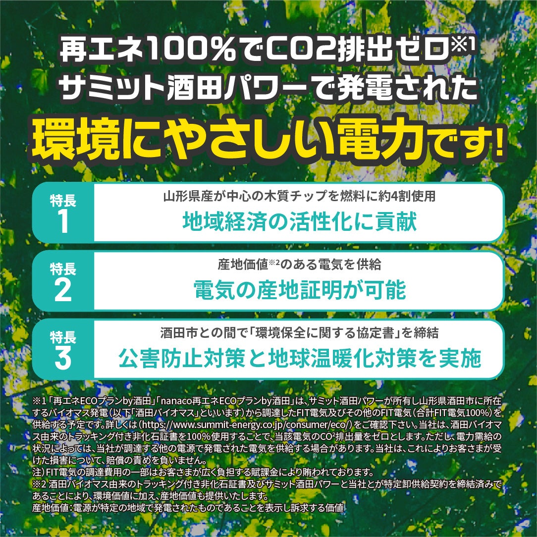 この酒田産電気は、酒田市に所在する『サミット酒田パワー』が木質バイオマスを燃料に発電した再生可能エネルギーとなっております。トラッキング付非化石証書(バイオマス由来)及び特定卸供給契約により、環境価値+産地価値も提供いたします。