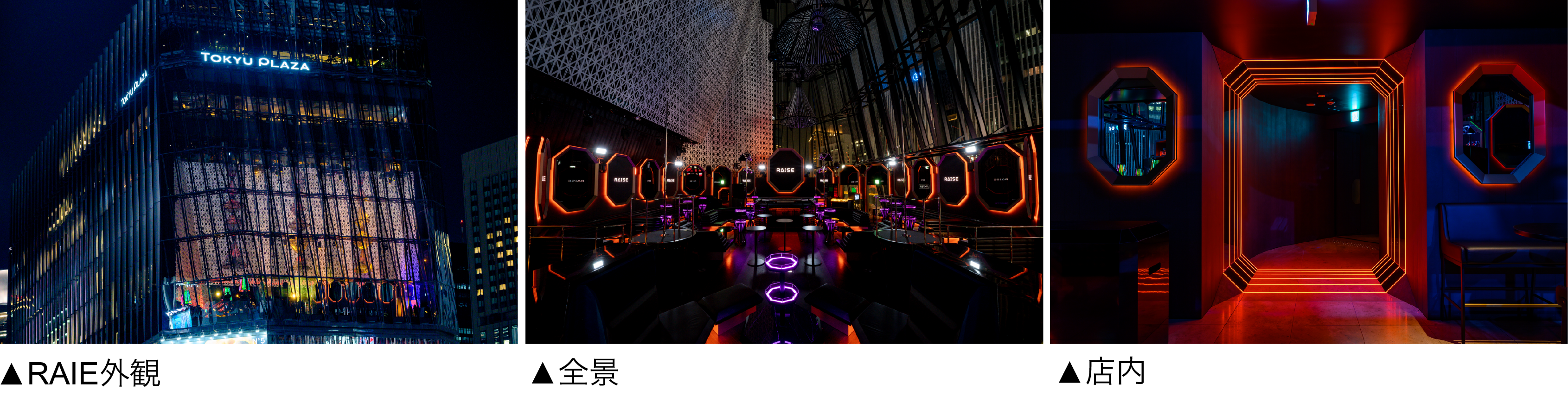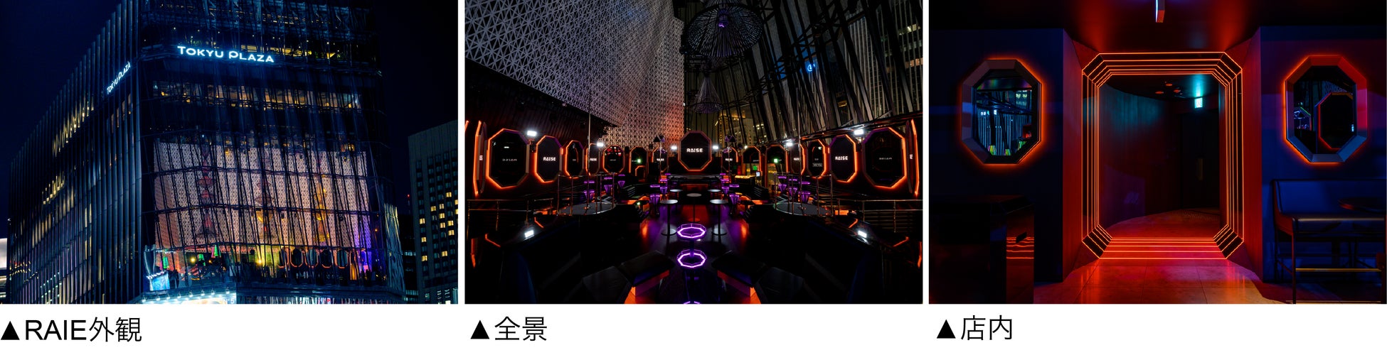 RAISEは、「最上級のナイトライフを創造する」をコンセプトに、東京・銀座5丁目数寄屋橋交差点のランドマーク、大型商業施設「東急プラザ銀座」6階にオープンした、大型 VIPラウンジ&クラブです。 世界のナイトクラブで も類を見ない天井高約27mという圧倒的なスケール感と、銀座の夜景を望めるガラス張りの煌びやかな空間に、近未来の都会的な夜をインストール。RAISE クリエイティブチームによる、ブラックとゴールドを基調としたシック な内装には、独創的でシンボリックなLEDビジョン、重厚感のあるソファーシート、近未来的なマテリアル、野外フェスレベルの最大出力の特殊効果・演出装置を採用しました。開放的なダンスフロア、コンセプトの異なる3つのバー、快適で遊び心のある22テーブルのVIP / VVIPシート。上質な音楽とシャンパンをはじめとした豊富なドリンクを楽しみながら、ドレスアップして大人が楽しめる都会的なラグジュアリー・ナイトライフを提案します。