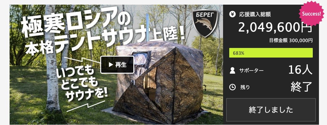 【目標金額683%突破!】極寒-50℃でも使用可能なテントサウナ「BEREG(べレグ)」が再びクラウドファンディング!