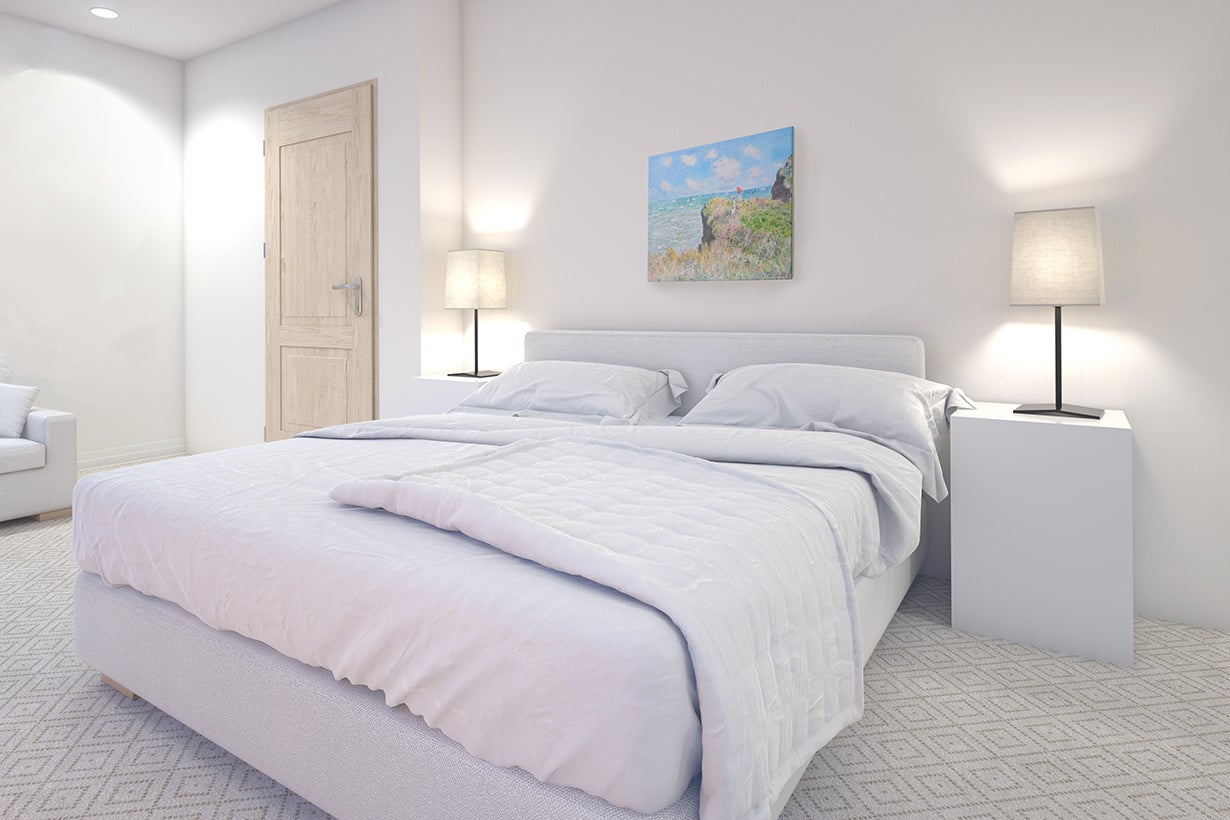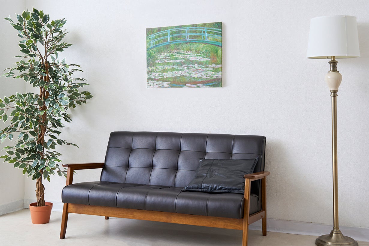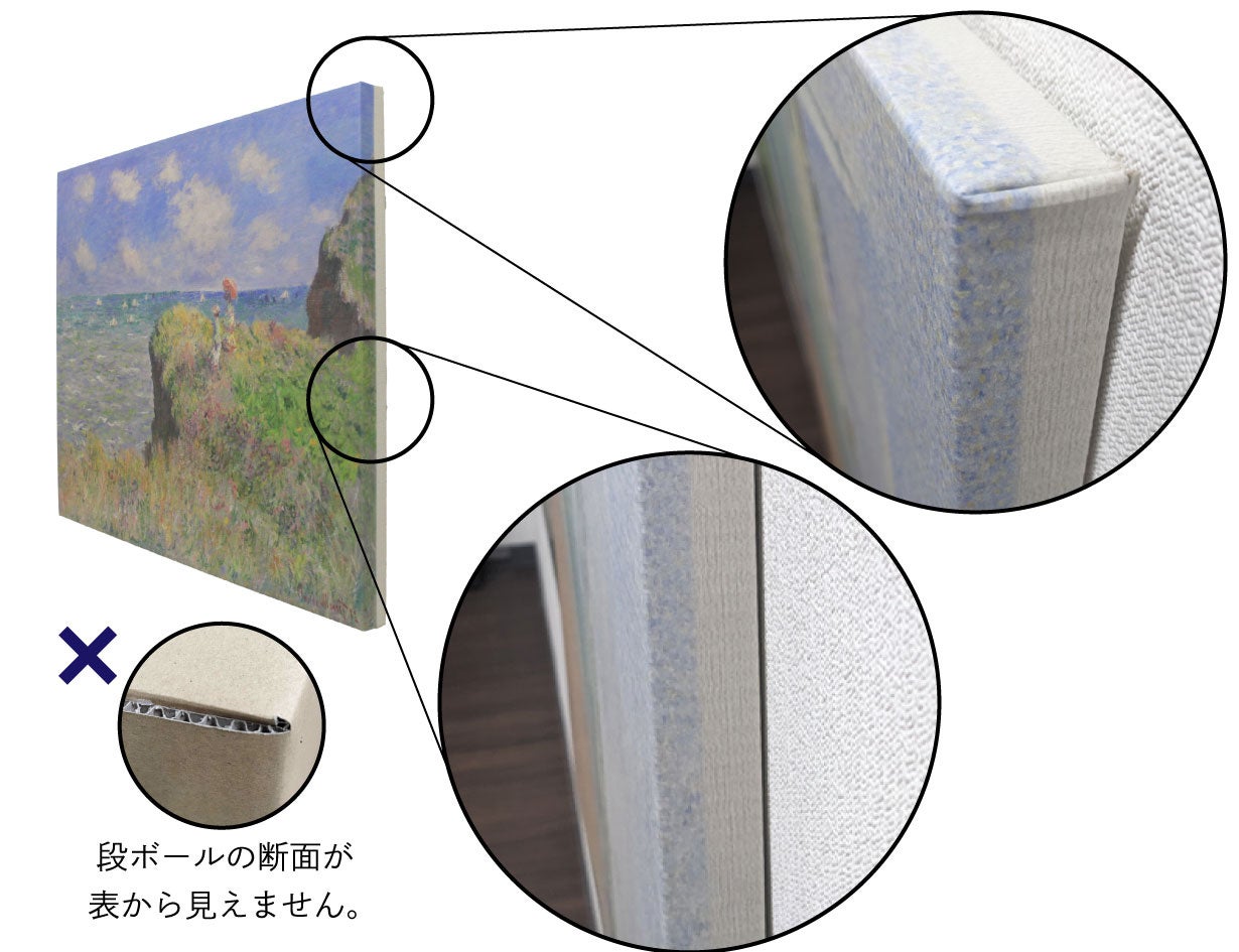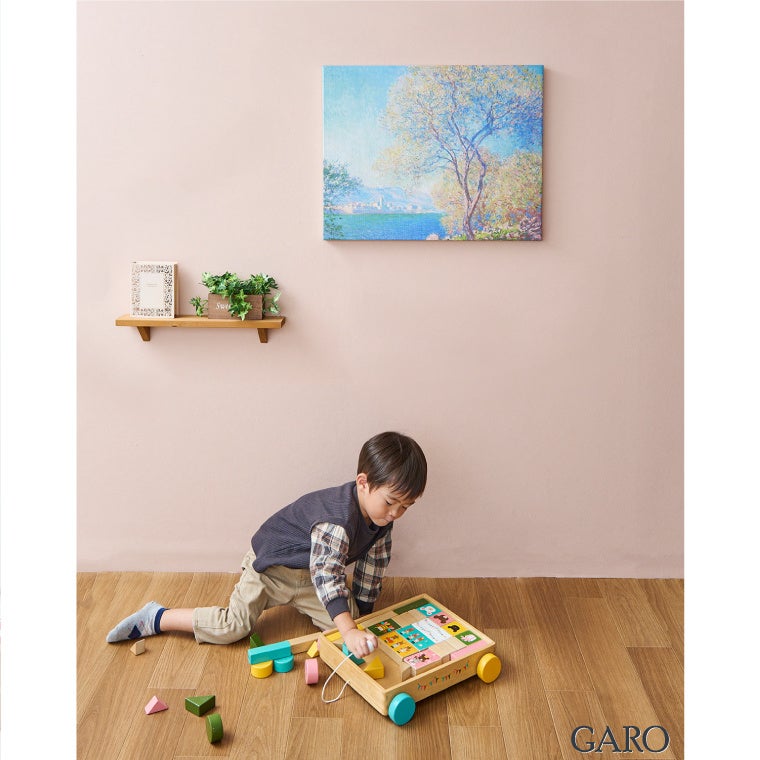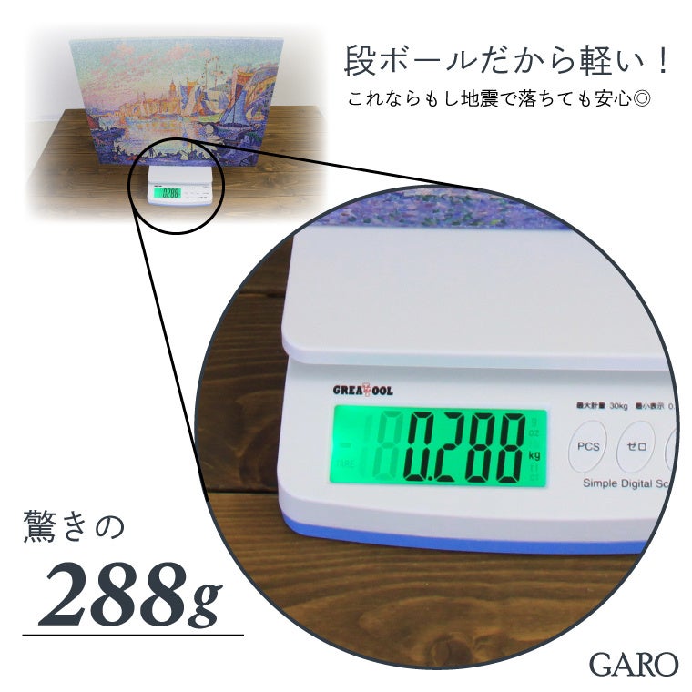 「名画パネル GARO」は段ボール製です。軽いので持ち運びもしやすく、壁に穴を開けるなど大掛かりなことをしなくても取り付けが簡単にできます。他の額縁に入れた絵画と違い、地震やぶつかって落下しても破片が飛び散って怪我をする心配も少なく、床も傷つきません。小さなお子様のいるお部屋にも安心して飾れます。