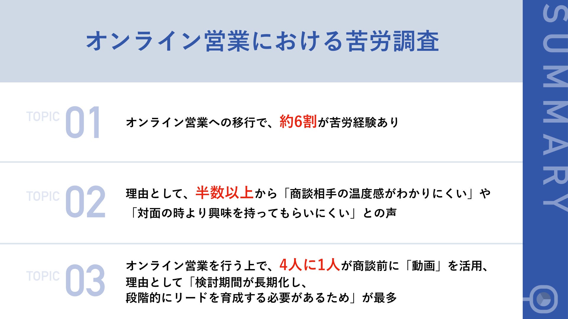 オンライン営業への移行により、約6割の営業パーソンが「対面の時より興味を持ってもらいにくい」や「商談相手の温度感がわかりにくい」、「そもそもオンライン商談にまで運べない」などという苦労を経験したことが分かりました。