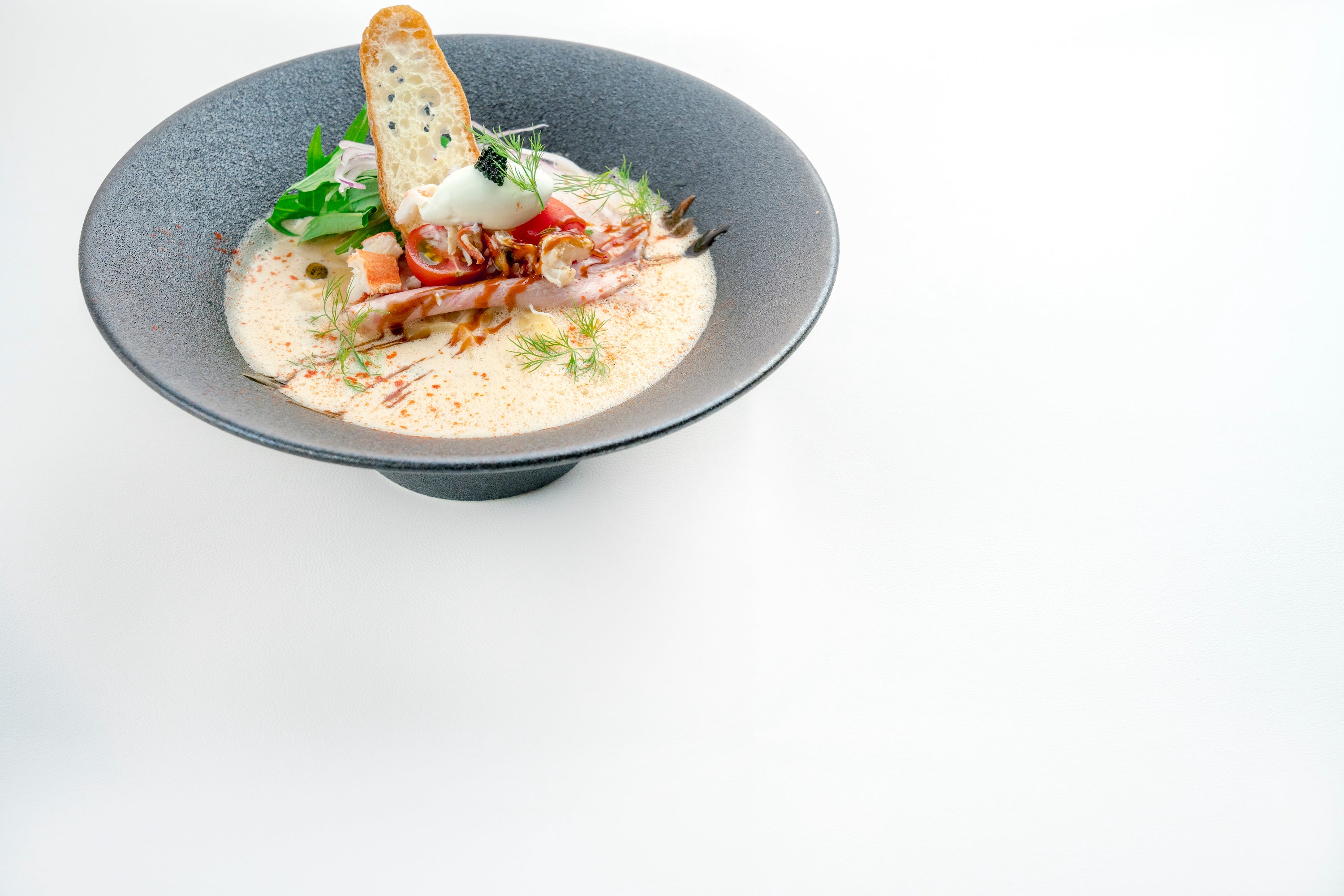 その出汁を上質なコンソメ・ド・ヴォライユ(鶏のコンソメ)と合わせて作り上げた、海老の香り引き立つスープを「豆乳」で仕上げ、まろやかでクリーミーな風味を実現しました。