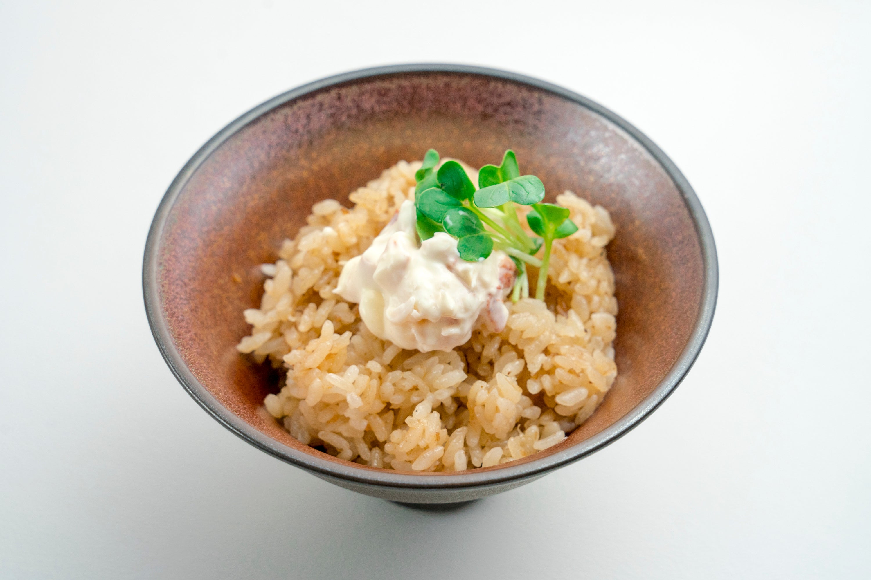 海老の旨味と一緒に炊き上げた海老ご飯に、自家製海老タルタルを添えて。