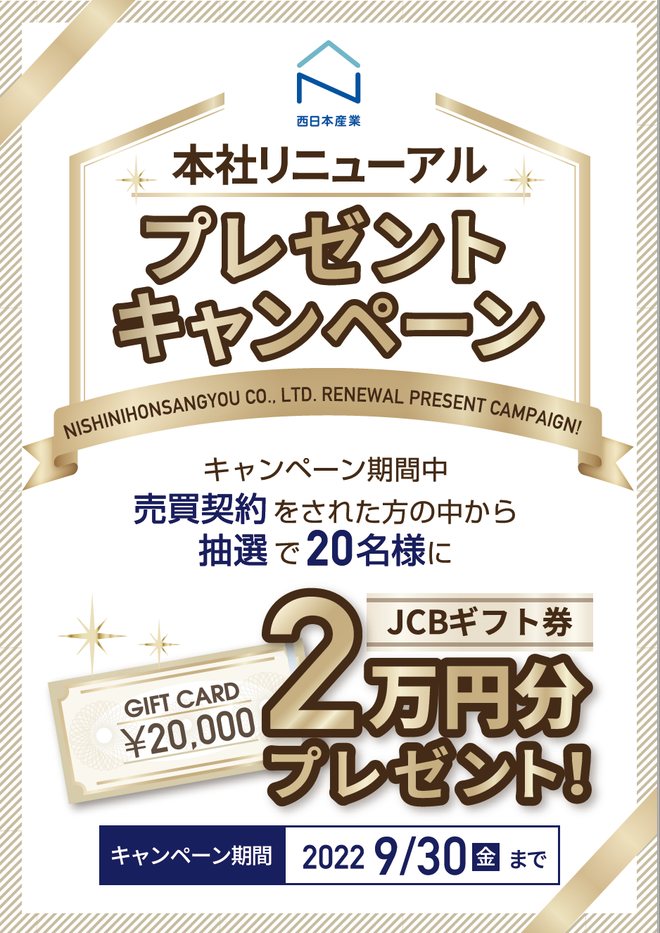 期間中に不動産売買契約をいただいた方の中から抽選で20名様にJCBギフト券2万円分プレゼント。