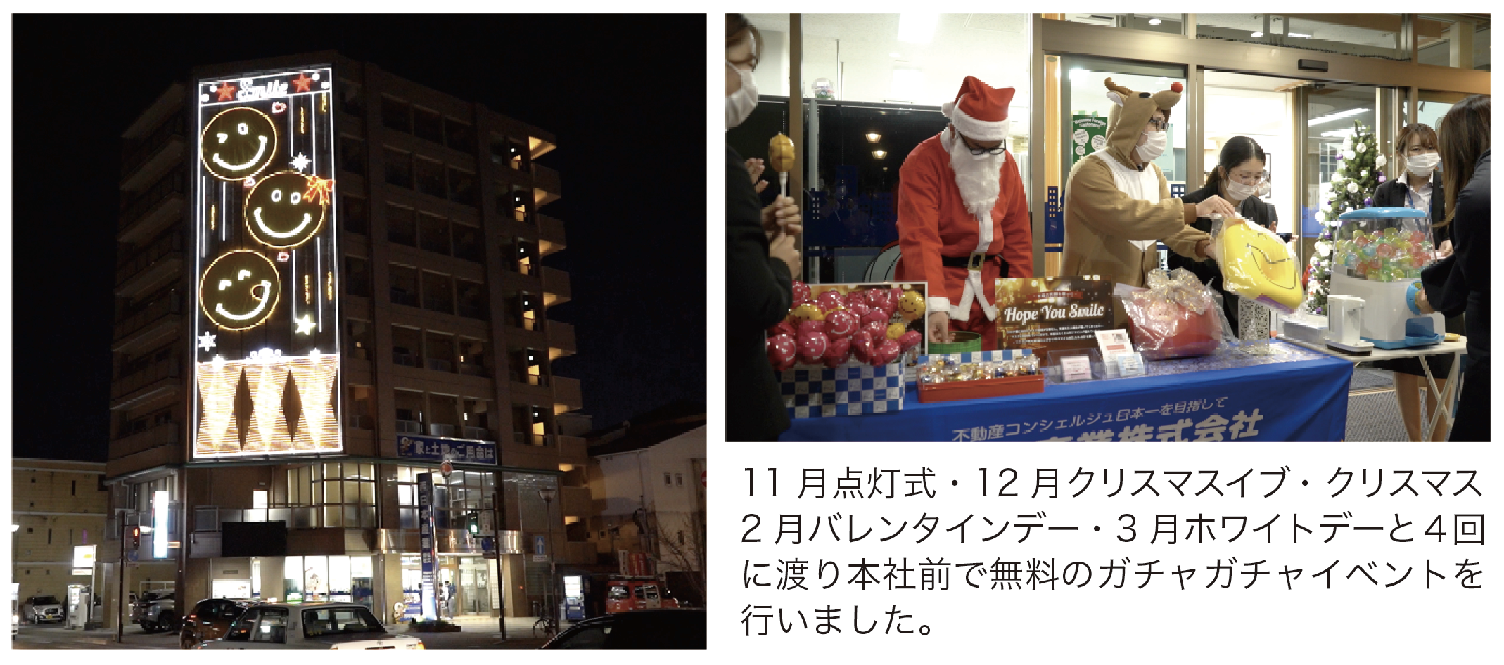 近年では不動産事業だけにとどまらず、「動く、地域の為に。」をテーマに、地域を盛り上げていくための取り組みに注力しています。その取り組みの一環として、2007年より毎年冬に行われている本社イルミネーションを、昨年は参加型のイベントにし、花畑駅前を盛り上げました。