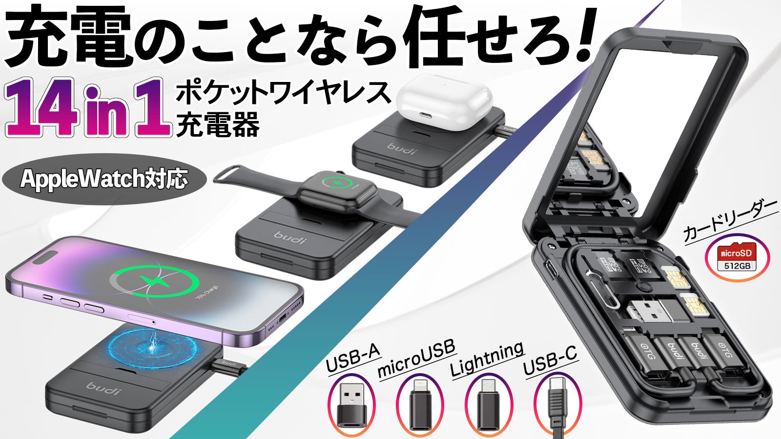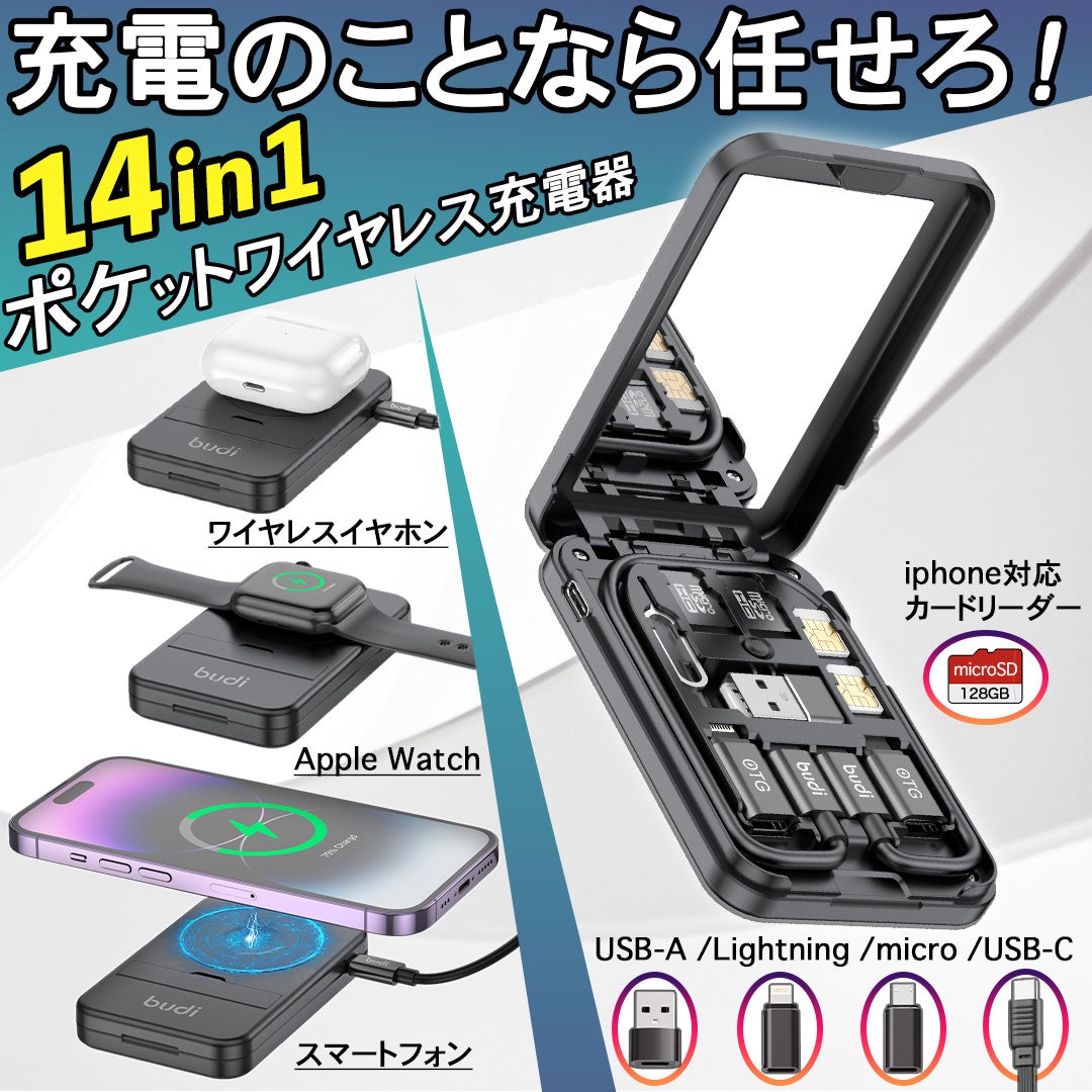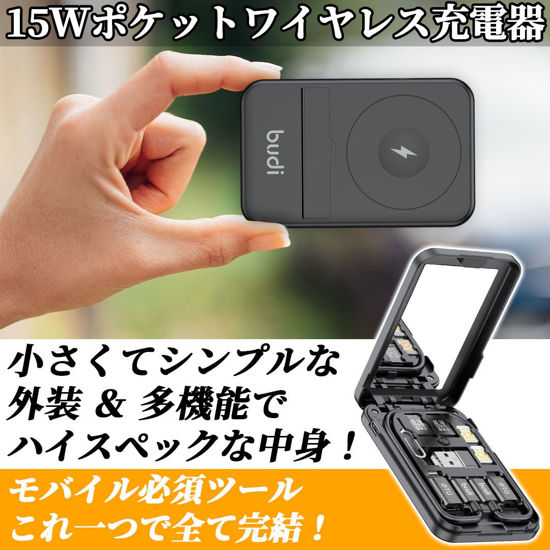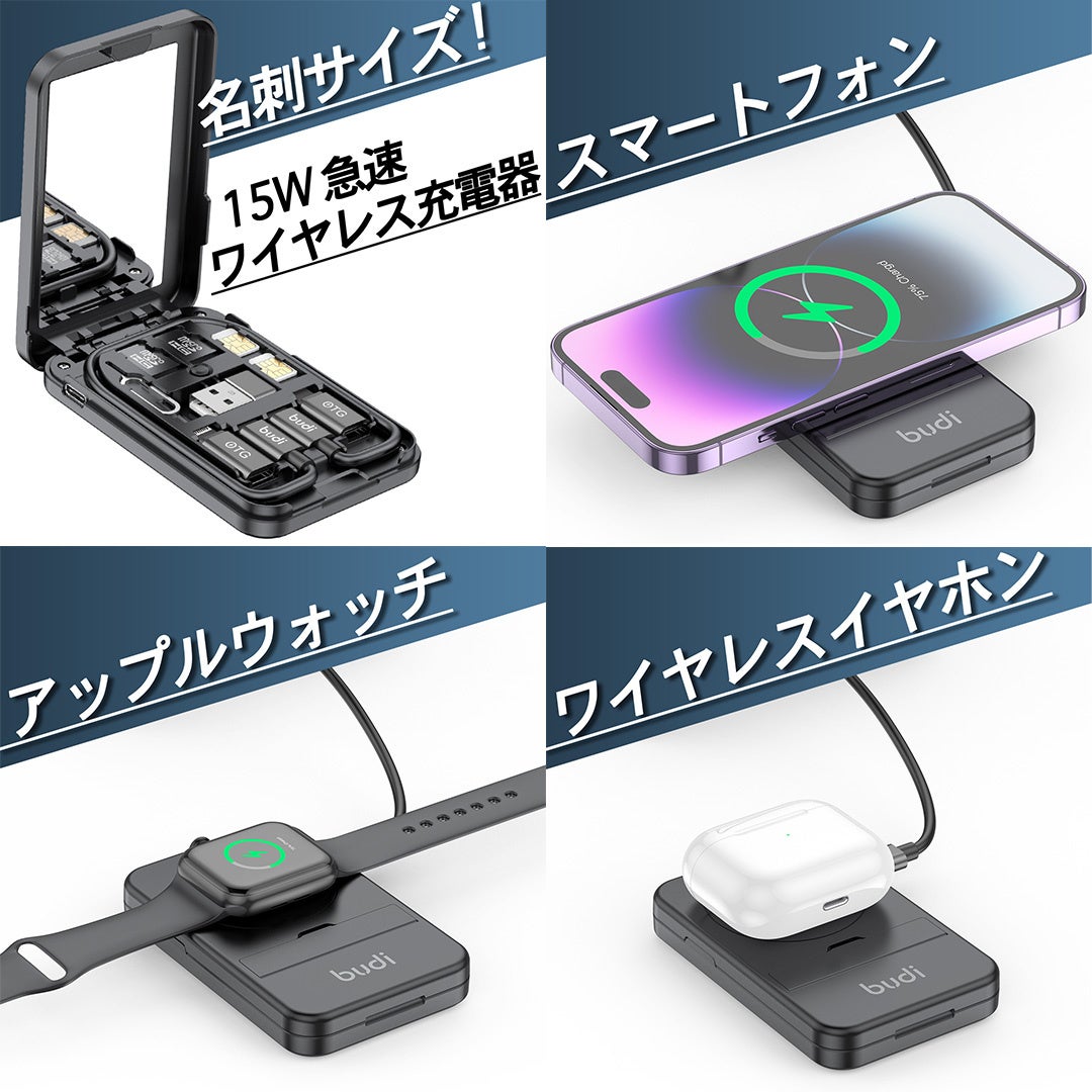 超便利!【15Wポケットワイヤレス充電器】スマホ、イヤホン、アップルウォッチまで充電!カードリーダー、充電ケーブル、他にも様々な機能をこれ一つに搭載!