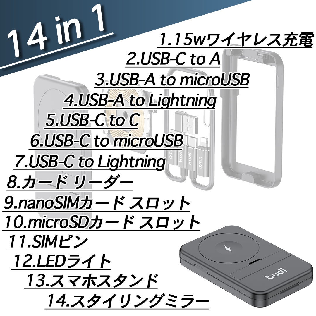 名刺サイズの急速15Wワイヤレス充電器!スマホ、イヤホン、アップルウォッチまで充電、更にiphone対応のカードリーダー、6種類に繋がる充電ケーブル&アダプター、データカード収納、LEDライト、SIMピン、スマホスタンドこれら全てを搭載!しかもポケットに収まる驚愕の便利ツール誕生です!