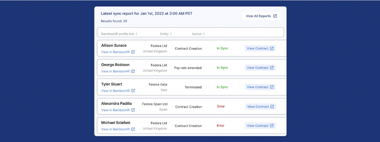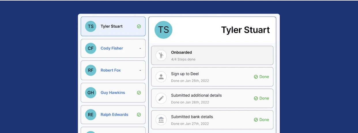 Workday、BambooHR、Hibobとの統合により、手作業を排除し、人事ツール間のデータの不整合を解消します。人事管理システム(HRIS)で雇用の詳細や給与情報を更新すると、その変更は自動的にDeelに同期されます。