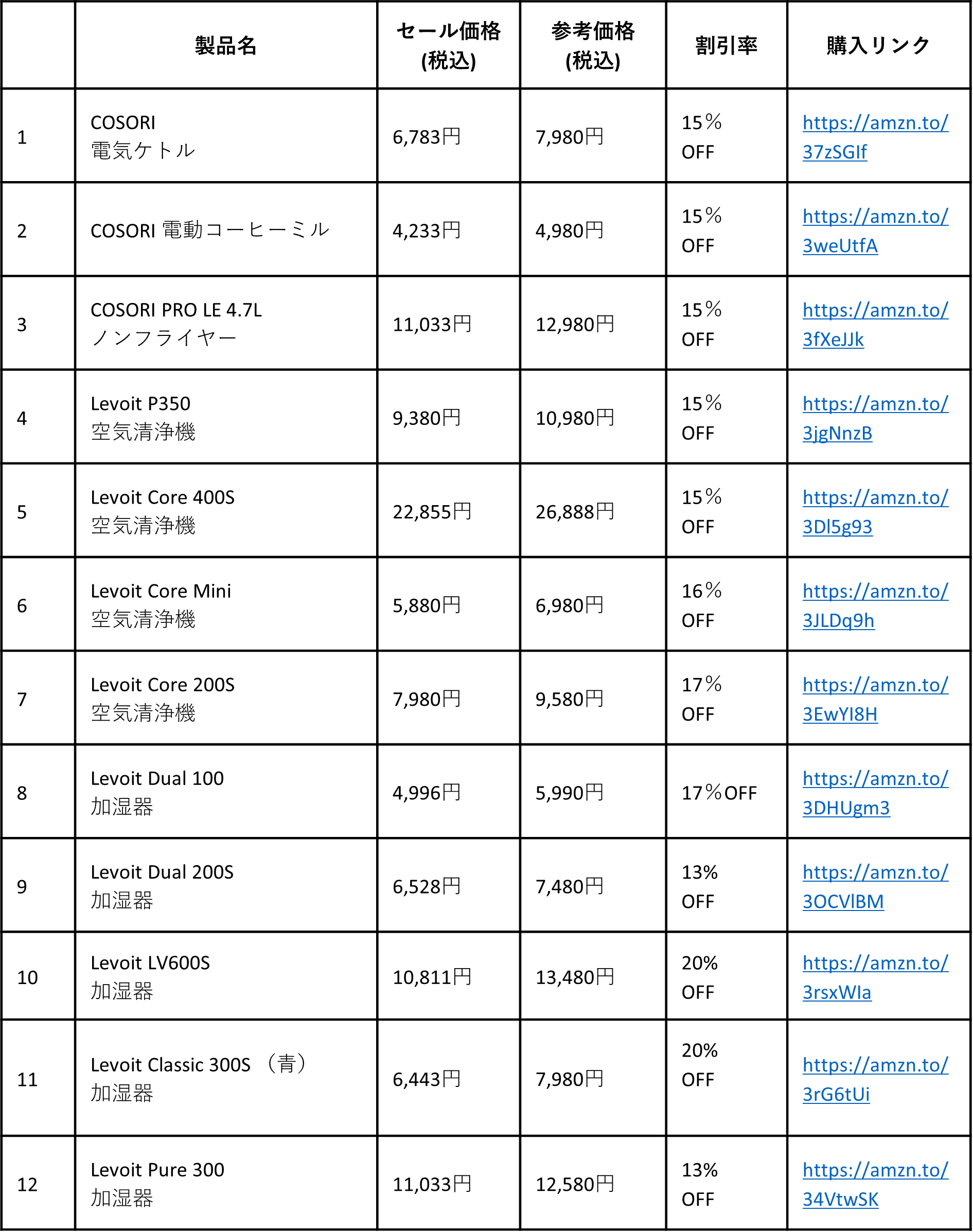 対象製品 : COSORI ノンフライヤー・Levoit 空気清浄機・Levoit 加湿器など15点