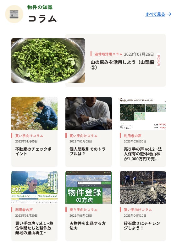 "利用者の声””専門家コラム””買い手/売り手向けコラム”など、サイトを利用いただく方のためのお役立ち情報が日々追加されていきます。