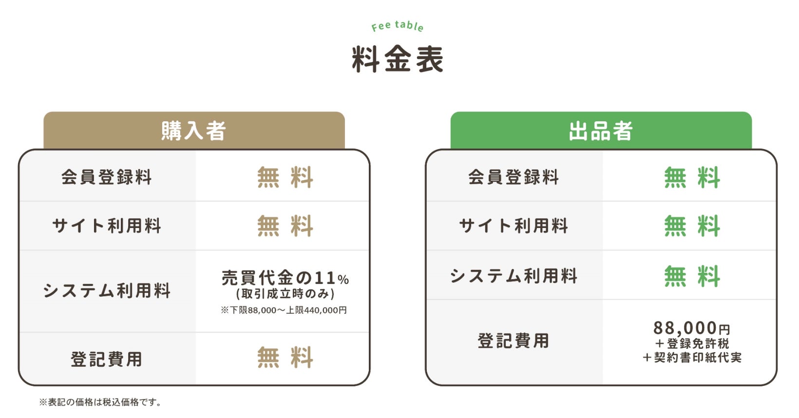 当サービスでは、売り手・買い手ともに取引が成立するまでの間は一切の料金がかかりません。契約成立時のシステム利用料等も明瞭な料金設定で、最後まで安心して取引することができます。