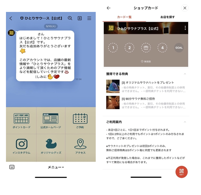 1来店ごとに1日1回までポイントが付与され、3ポイント貯まるとオリジナルサウナハットと交換でき、5ポイント貯まるとサウナの90分枠を無料でご招待させていただきます。