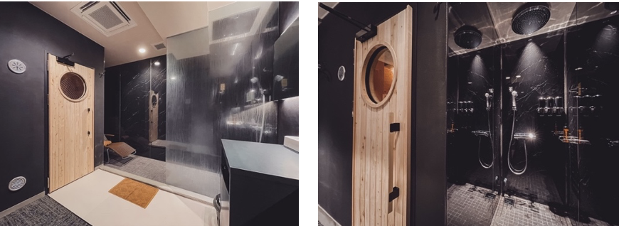日本国内に数少ないサウナ専門の職人によるこだわりのハンドメイドのサウナ室は檜の板張りづくりです。サウナ室内も広さにこだわり全室約2.5平米の広々とした空間に長さ200cm×奥行き60cmのベンチと枕を設置しているため、寝転ぶこともでき、お一人様利用としては贅沢なサウナ室空間となっております。新設サウナならではの檜の香りを堪能しながら、ご自身のスタイルに合わせてゆったりとおくつろぎください。