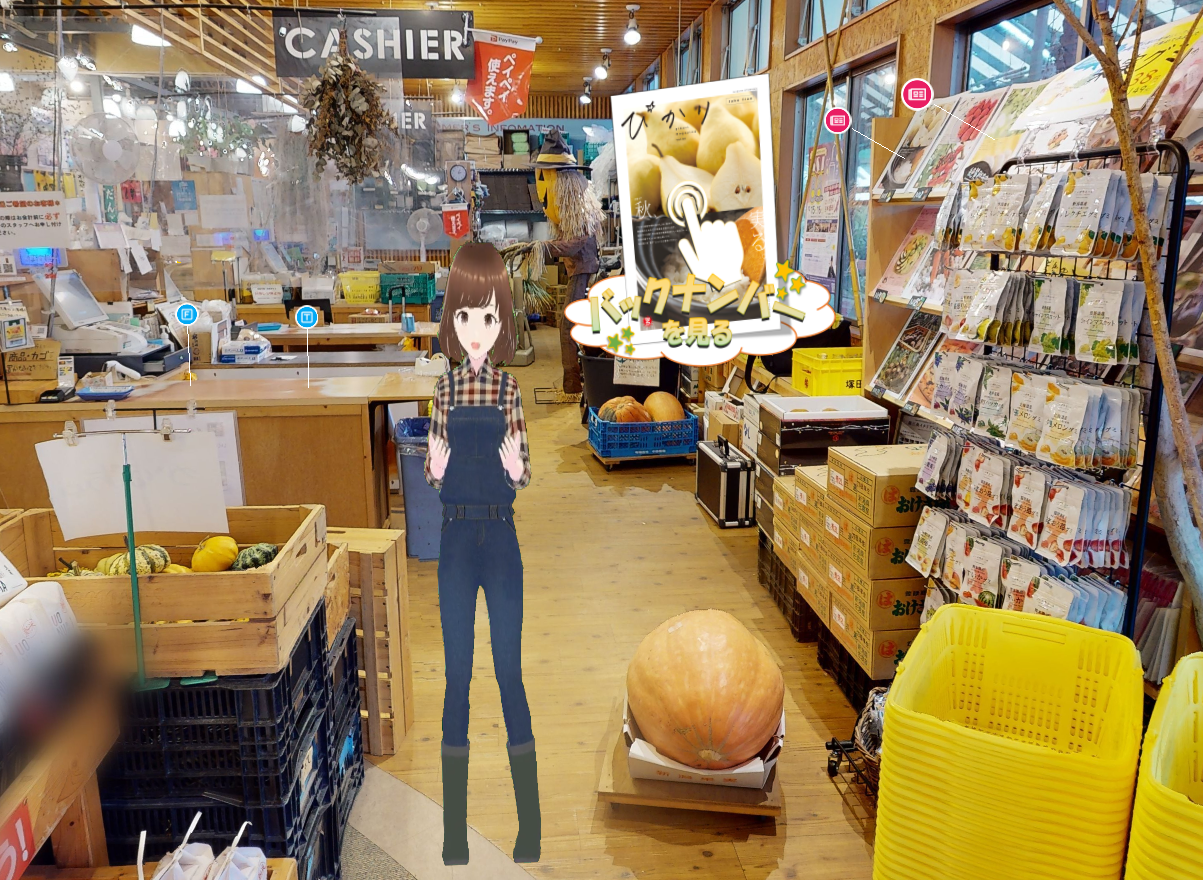 産直市場のリアル店舗をもとに構築したバーチャル空間です。主に以下の4つの仕組みによって、バーチャルならではの新しい購買体験を提供することを目的としています。