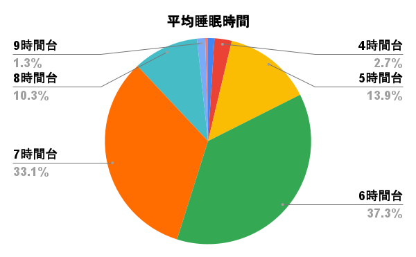 - 全体の半数以上がが7時間以下の睡眠時間の為、睡眠負債をかかえている