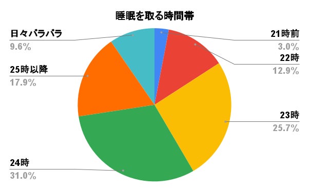 - 23時以降に寝る人が全体の約7割もおり、全体的に夜型傾向