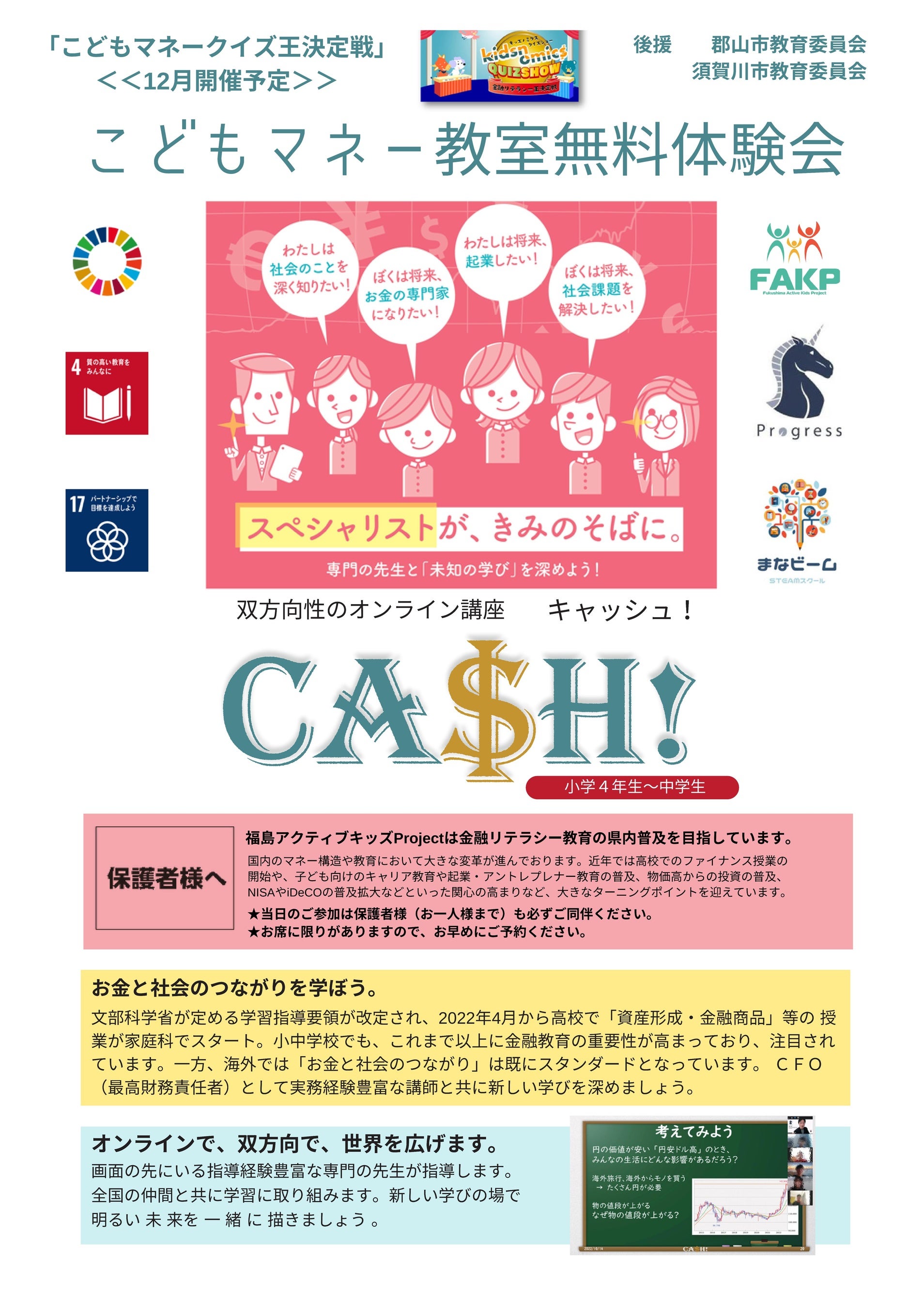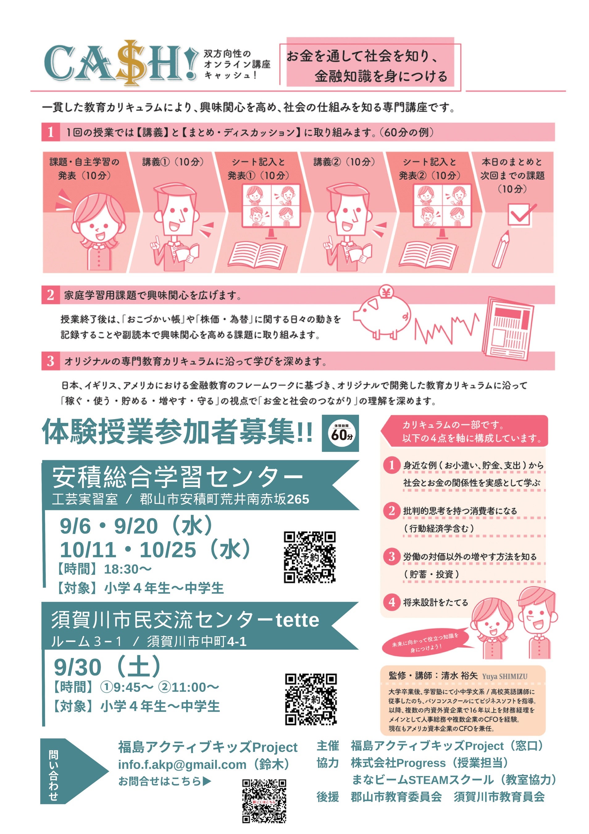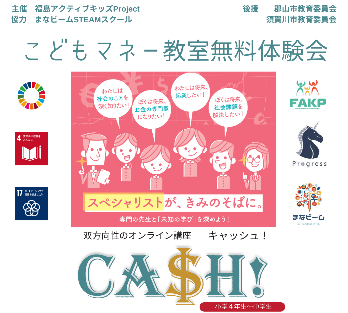 福島アクティブキッズProject(代表 鈴木 孝英 代表理事:福島)と株式会社Progress(代表 秦 有樹:福岡)は、こども向け金融リテラシー講座 CA$H!を開始することを決定しました。同講座は10月開講を予定しており、それに先立ち9月に体験授業を実施いたします。現在、無料体験授業の申し込みを受け付けております。