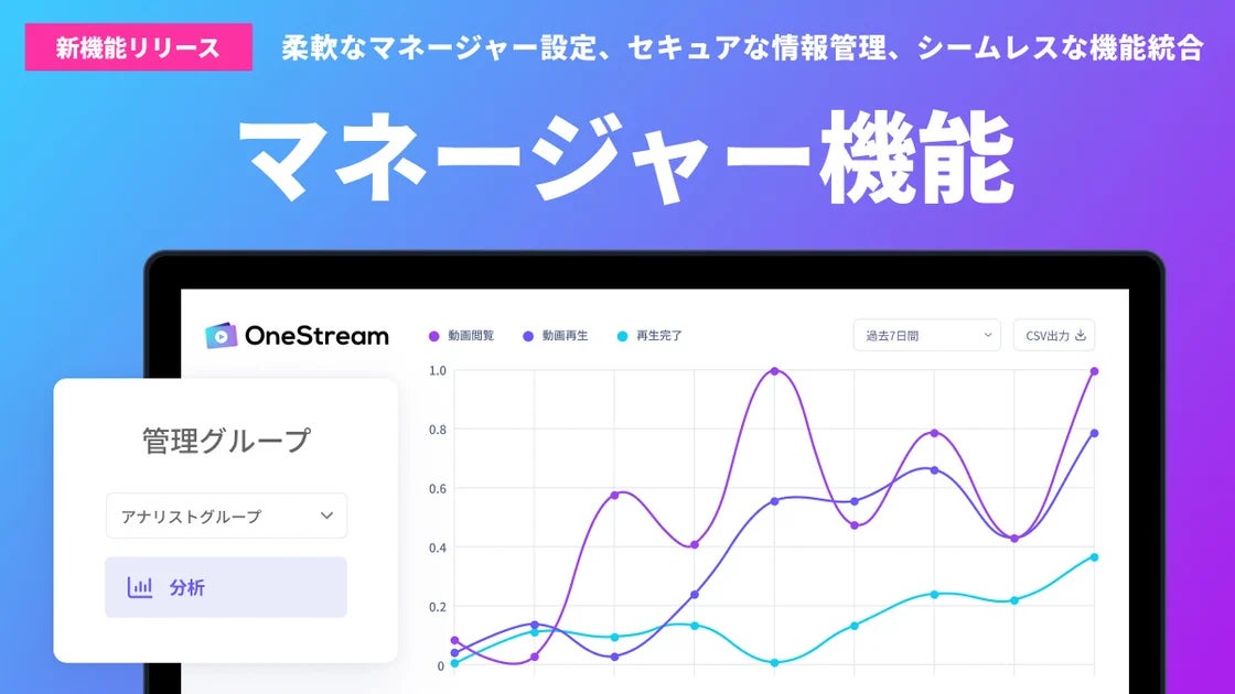 誰でも簡単に動画サイトを構築可能なサービス「OneStream」を展開する株式会社ルートチーム(本社:東京都中野区、代表取締役:澤居宏紀)は、2019年のサービス開始以降、現在までで累計500社の導入を達成。2024年末にかけて「マネージャー機能」「動画バージョン管理機能」「メールアドレスのCSV一括取り込み機能」をリリースし、今後も新機能を続々と開発します。ここでご紹介する新機能では、さらなる動画サイト運用の効率化、柔軟性、セキュリティ強化が可能になっています。詳細は公式ウェブサイト(https://onestream.jp/posts/top)でご確認いただけます。
