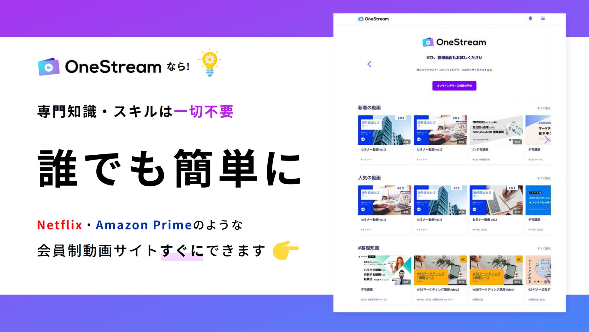 OneStreamは自社ブランドで、Netflixやhuluのような動画サイトを誰でも簡単に構築できるサービスです。初期費用無料、月額9,800円から。セミナー、オンラインスクール、社内教育など、ノーコードで簡単に構築できます。2024年は、多くの企業やクリエイターの皆さまに支えられ、OneStreamの導入社数が500社を突破するという大きな節目を迎えることができました。OneStreamは定期的なアップデートや改善を重ね、皆さまの動画を活用したビジネスの成長を支えるパートナーであり続けることを目的として引き続き運営してまいります。