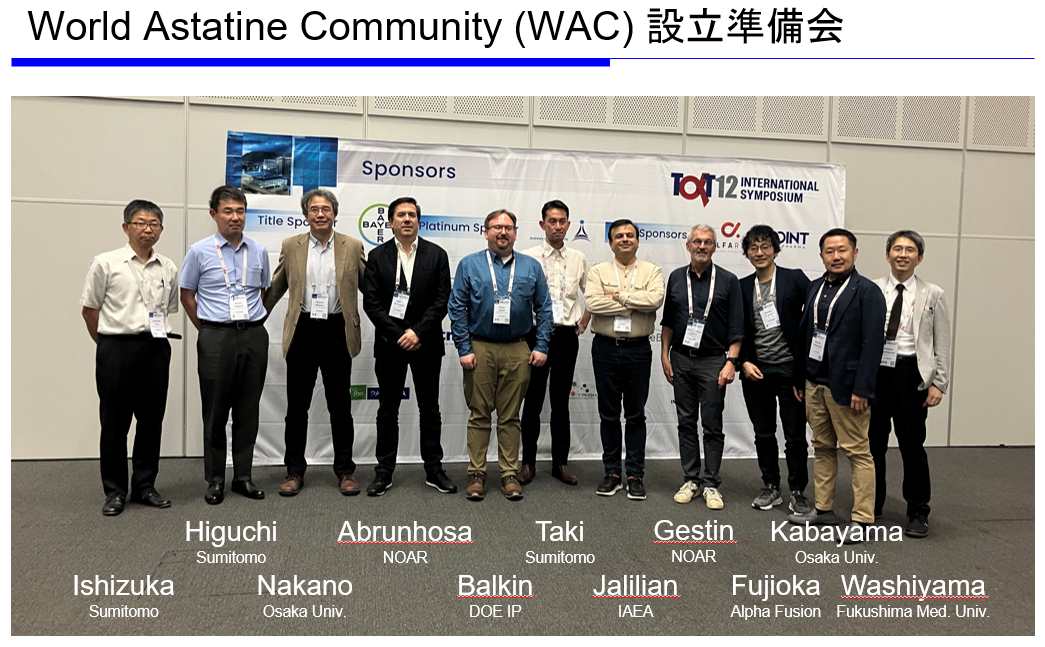 当該会議では、アスタチン創薬の実現に向け、日米欧の協力体制(World Astatine Community; WAC)の組成が発表されました。WACには、日米欧の研究機関に加え、民間企業として、当社の株主でもある住友重機械工業様(https://www.shi.co.jp/info/2023/6kgpsq000000mluy.html)と、創薬を世界で担う企業として当社の存在も世界に公開されました。