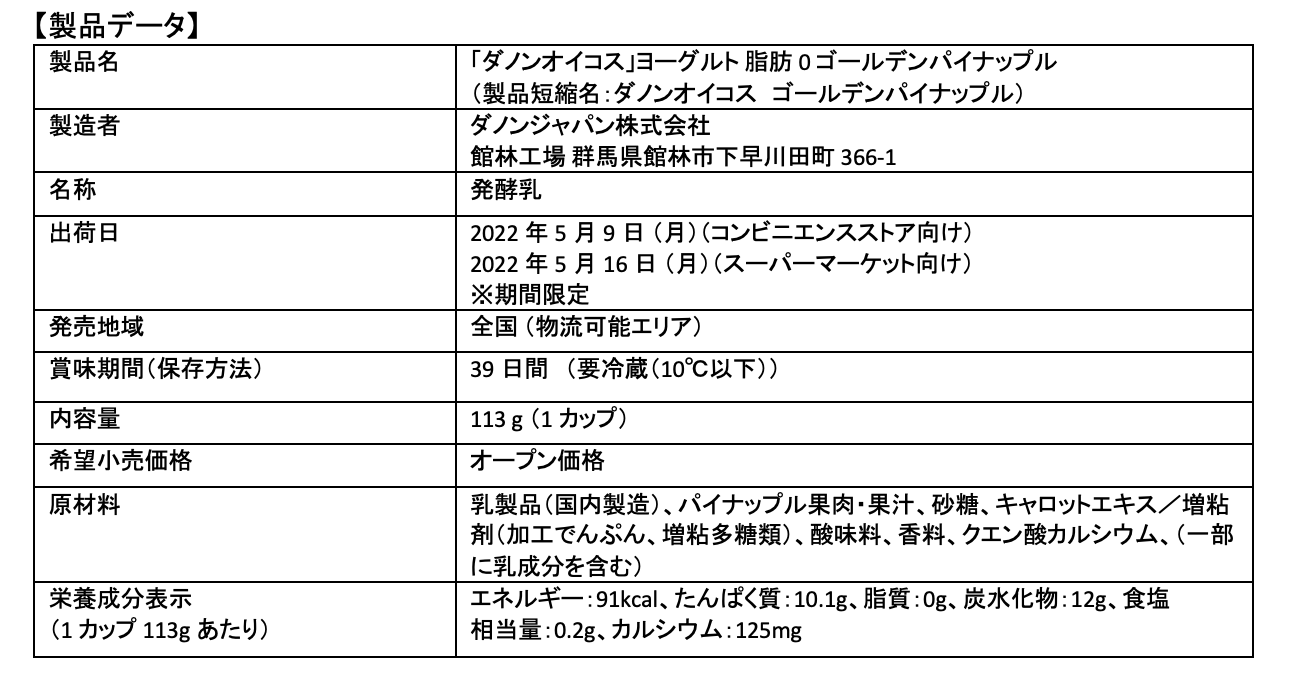 ダノンジャパン株式会社(本社:東京都目黒区、代表取締役社長:ローラン・ボワシエ)は、高タンパク質で、すべてのスポーツをする人を応援する “カラダ動かす、ジブン追い越す“ 水切りヨーグルト「ダノンオイコス」より、期間限定製品、「ダノンオイコス 脂肪0(ゼロ) ゴールデンパイナップル」を、5月9日(月)より全国のコンビニエンスストア向けに、5月16日(月)より同スーパーマーケット向けに出荷を開始いたします。