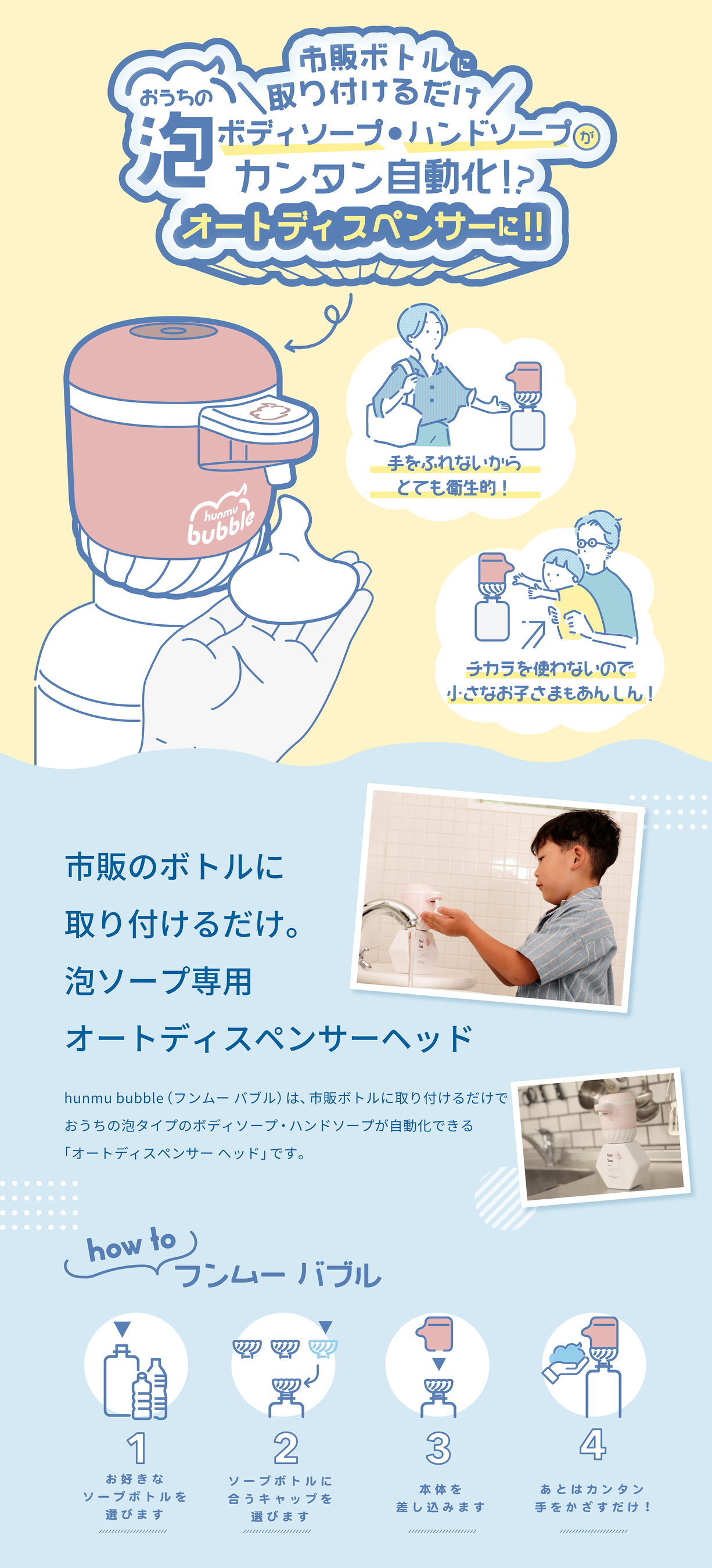 hunmu bubbleは、ドラッグストアなどで売られている泡タイプのボディソープやハンドソープに取り付けて使うオートディスペンサーヘッドです。だから、詰め替えの手間も、詰め替えのときにこぼして掃除する…、なんて手間もゼロなんです!