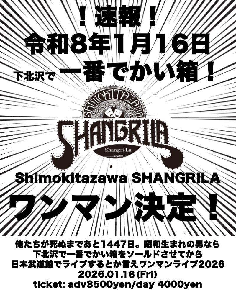 次なる一手は2026年1月16日(金)ホーム下北沢で一番大きいライブハウス「Shimokitazawa SHANGRILA」にてワンマンライブが決まっています。こちらもぜひ宜しくお願いします。