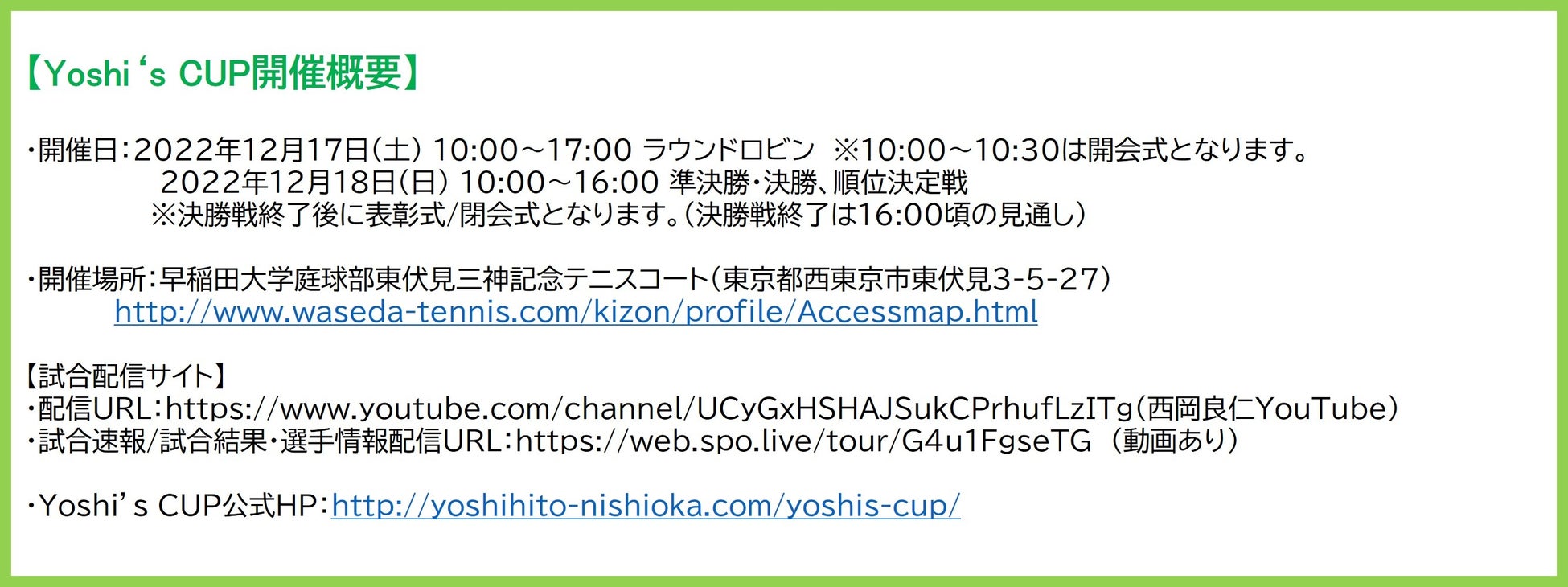 プロテニスプレーヤーの西岡良仁(以下、西岡選手)は、『世界で羽ばたける日本人テニスプレーヤー育成』を目標とし、有望なジュニアテニスプレーヤーを対象にしたテニスイベント「Yoshi’s CUP」を17日(土)と18日(日)の二日間、東京都・早稲田大学庭球部東伏見三神記念インドアテニスコートにて開催します。