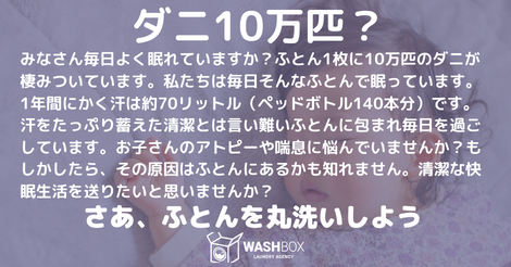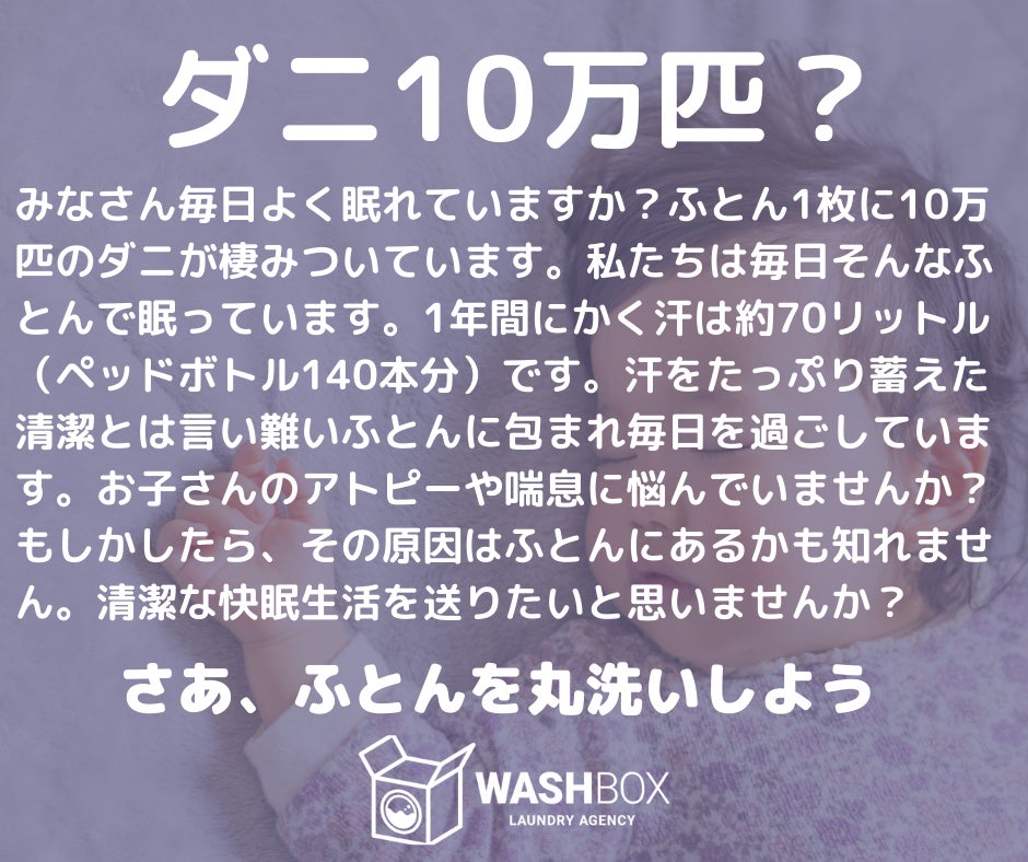 「ふとん丸洗い」はコインランドリーの普及とともに少しづつ市民権を得てきておりますが、まだまだ世の中に浸透しているとは言えません。ふとん1枚にダニが10万匹いるとされることや、1年間に70リットルの汗がふとんに蓄積されていることはあまり知られてません。これらはアトピーや喘息の原因にもなっており、その解決策として「ふとん丸洗い」をWASHBOXは推奨しております。