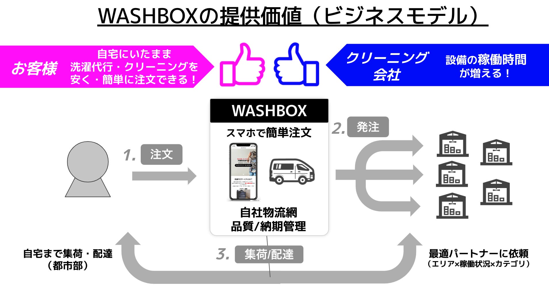 洗濯代行とクリーニングをスマートフォンから2タップで依頼できるネット(宅配)ランドリーサービスです。クリーニング業界の抱える課題を市場全体から俯瞰することでユーザーとクリーニング工場の双方に価値提供を行っています。WASHBOXを通してユーザーは店舗に行かずに低価格・短納期でクリーニングが利用ができます。一方でクリーニング工場は遊休資産化している設備や人員の生産性を上げることが可能になります。