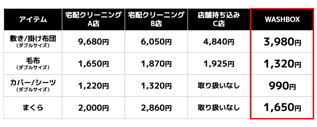 一般的なクリーニング店と比較して、WASHBOXはリーズナブルな価格設定を実現できおります。特に宅配クリーニング業者は大手物流業者に集荷・配達を委託しており、ふとんなどの大物は往路配送費が高くなります。そのため、どうしても割高な価格になっている現状がございます。その点、WASHBOXは自社物流による効率的な集荷・配送と、ふとんクリーニングに注力している工場と提携することでユーザーが日常使いできる価格帯でご提供が可能になっております。さらに新規会員登録20%OFFキャンペーンを実施しておりますので、さらにお得にご利用が可能です。