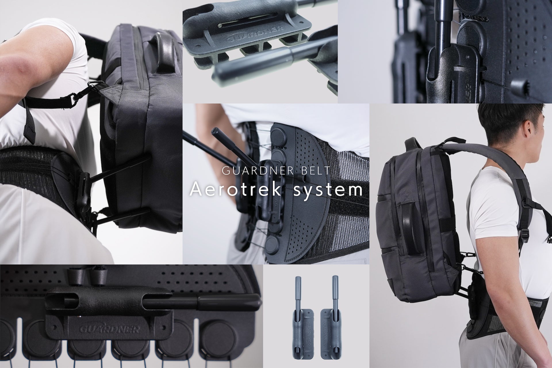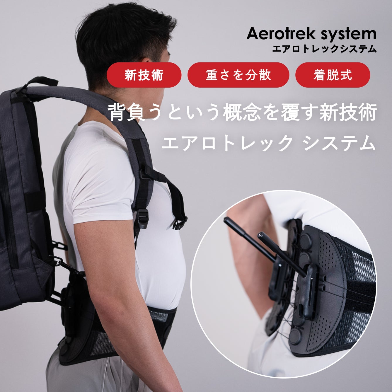 腰の悩みを解決し続けるその先に肩の悩みまでも全網羅。「エアロトレック×ガードナーベルト」の融合で背負うという概念を覆す新技術です。「エアロ(空気のように)トレック(移動する)」。まるでリュックを背負っていないような、無重力の体験をお届けします。