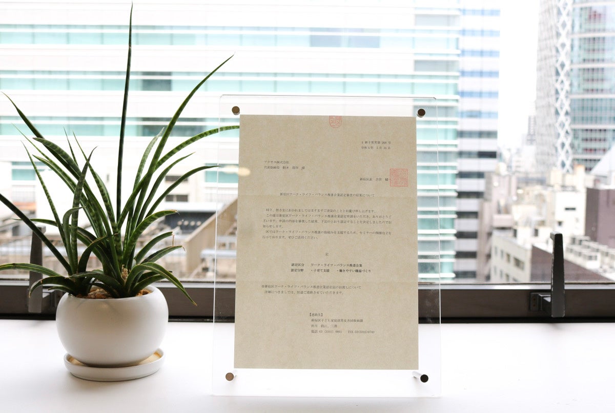 アクサス株式会社(本社:東京都新宿区、代表取締役:駒木 俊祥、以下アクサス)はこの度、本社所在地である新宿区から「新宿区ワーク・ライフ・バランス推進企業認定制度」において「子育て支援」「働きやすい職場づくり」の2分野に認定されました。