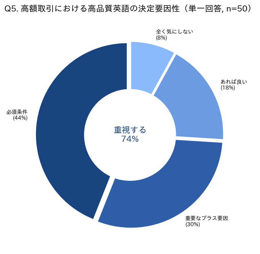 Q5. 高額取引ほど顕著:74%が「高品質な英語」を重視