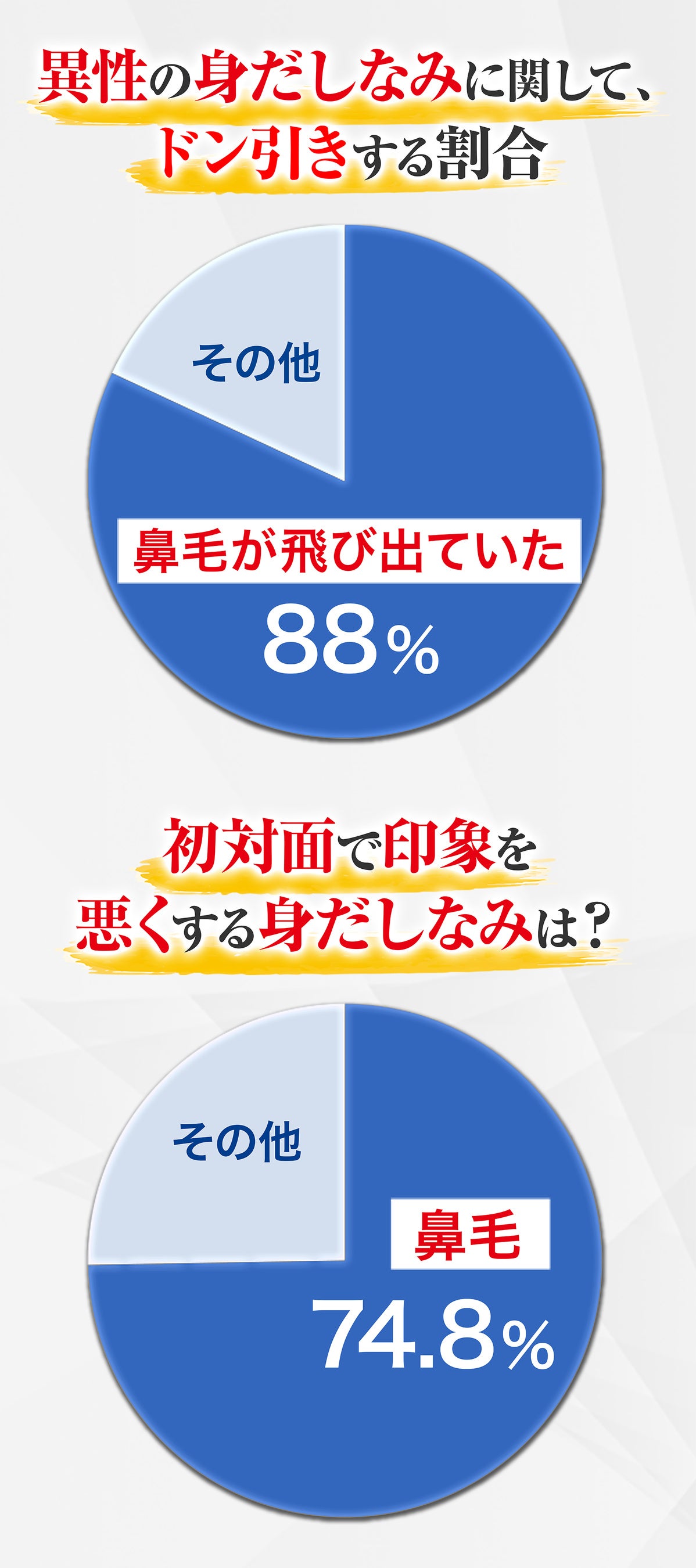 「どうせマスクで隠れるし…」とマスク生活に慣れてしまい、ムダ毛処理を疎かにしがちではないでしょうか?しかし、飲み物を飲む時や食事をする時など思っている以上にマスクを外す機会はあるのです!!そんな時「鼻毛が出ていたら…」私たちの調査の結果、9割の人が異性のドン引きする瞬間が【鼻毛が出ている】だったのです。