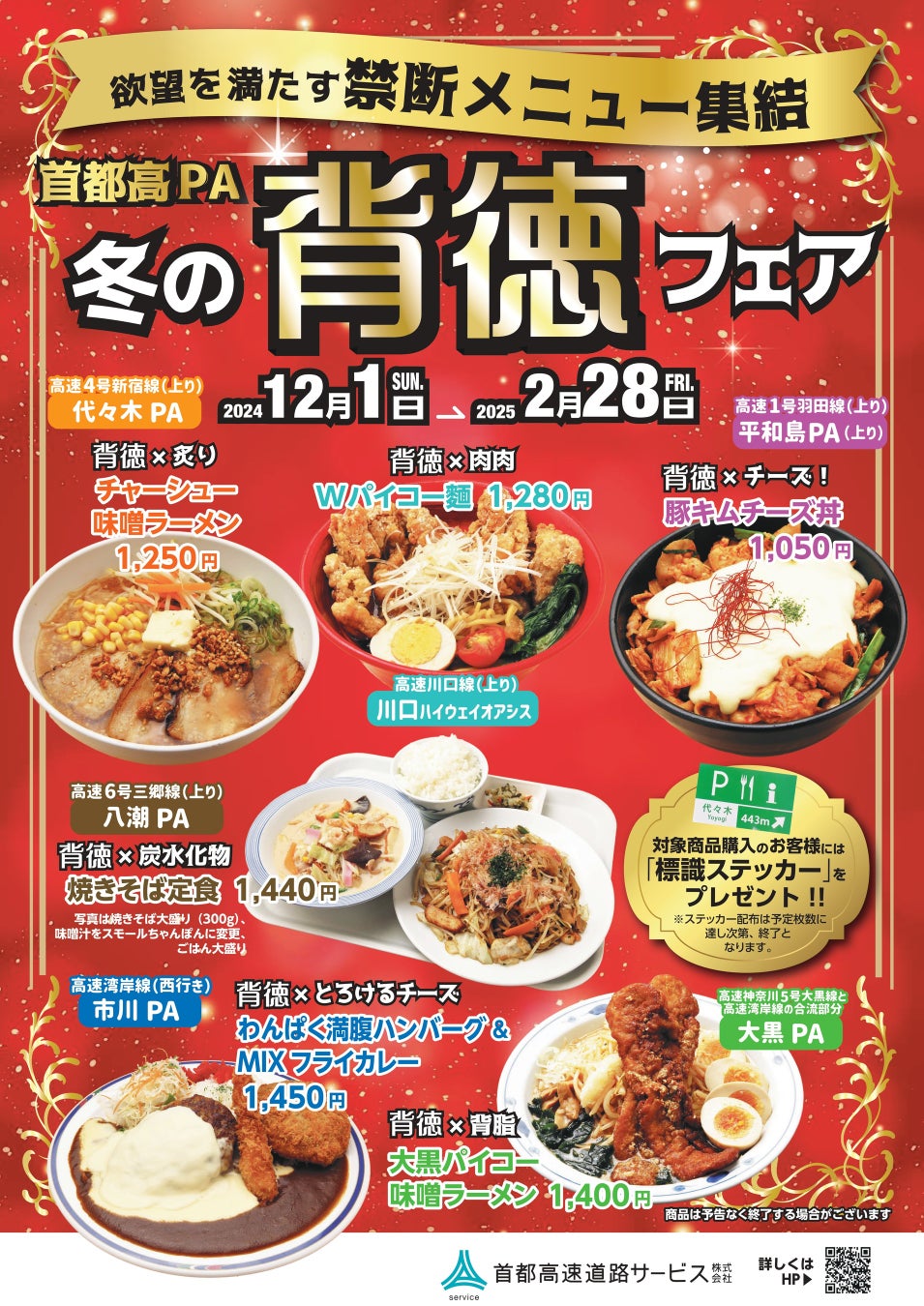 首都高速道路サービス株式会社は、首都高の各PAレストランで「罪悪感」を感じてしまうほど贅沢な味を存分にお楽しみいただける、「冬の背徳フェア」を期間限定で実施します。「背徳×チーズ! 豚キムチーズ丼」や「背徳×肉肉 Wパイコー麺」などPAの個性を活かしたインパクト大のメニューは、首都高PAを普段からご利用いただくビジネスドライバーのお客様から観光で立ち寄られるお客様まで幅広く楽しんでいただけるものを目指しました。各PA対象メニューをご購入いただいたお客様には、「標識ステッカー」をプレゼントします。(ステッカー配布は予定枚数に達し次第、終了となります)