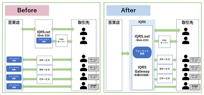 他のWeb-EDIサービスを利用している百貨店や取引先企業との接続も可能となり、これまで個別に連携・変換を行ってきた企業もこちらのサービスを一括でご利用いただけます。