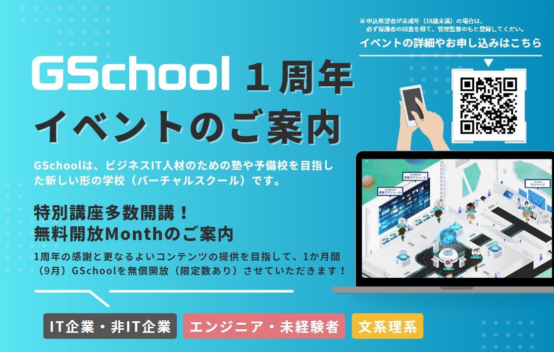 株式会社グリーンウォーターズ(本社:東京都千代田区、代表:水下 広之)は、ビジネスIT人材のためのバーチャルスクール「GSchool(ジースクール)」の開校1周年を記念して、2024年9月1日(日)~30日(月)の1カ月間、ご登録いただいた企業100社、社会人200名、学生300名に、GSchoolの全講座を無償開放いたします。また、各分野のプロフェッショナルによる特別講座を集中開講いたします。