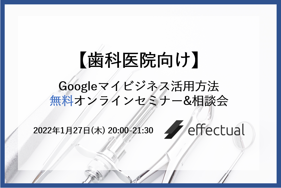 株式会社オール・デンタル・ジャパン(東京都台東区柳橋2-5-6)の協賛企業でもある株式会社エフェクチュアルが、2022年1月27日(木)20:00~21:30にZOOMにて、Googleマイビジネスの活用方法を相談できる無料セミナーを開催いたします。