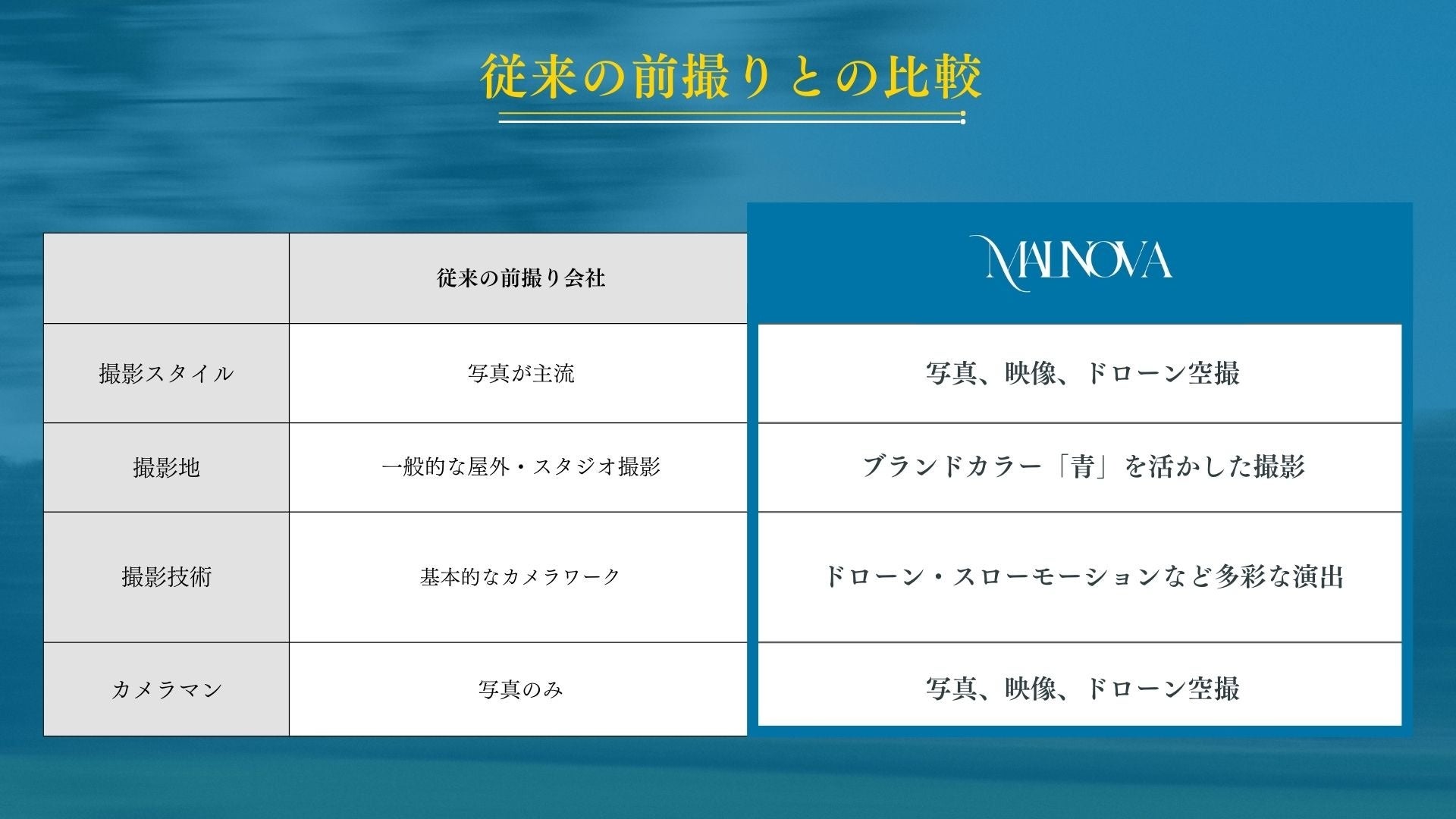 SNSの普及により、前撮り写真や映像をインスタグラムやTikTokに投稿するカップルが増えており、映像のクオリティはますます重要視されています。Malinovaでは、最新の映像技術を活用し、SNS映えする作品を提供することで、今後さらなる市場拡大を目指します。