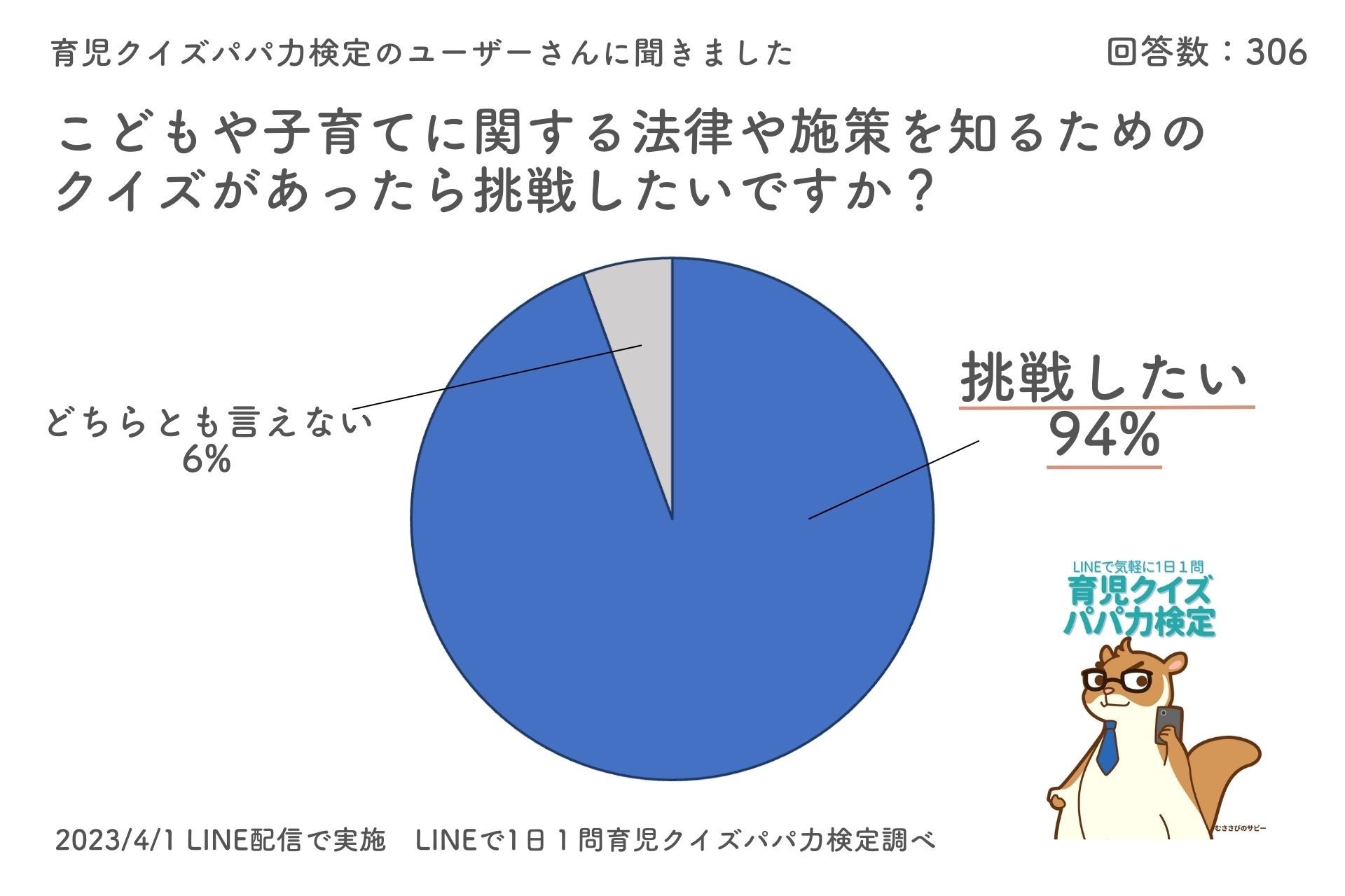 94%の方が育児クイズパパ力検定で、こどもや子育てに関する法律や施策を知るためのクイズがあったら「挑戦したい」と回答。「学びたい」と考えているパパさんママさんが多いことが伺えます。