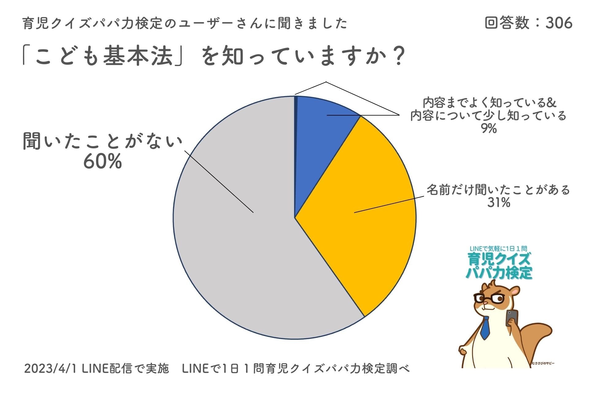 育児に役立つ知識をクイズ形式で提供し、パパの育児を応援している「育児クイズパパ力検定」は、令和5年4月1日「こども基本法」施行・「こども家庭庁」発足の日にアンケートを実施。306名から回答がありました