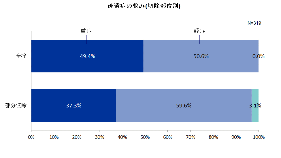 続いて、切除部位別、術後経年別に後遺症の重症度の比較について紹介します。一般的に、胃切除後の後遺症状は術後年数を経るに従って、少なくとも自覚的には自己コントロールと慣れにより軽減されると考えられています。しかし、2004年のアンケート結果では、重症の悩みは1年未満から2年目には若干減少するものの、3年目に入ると横ばいまたは微増しています。これは、「胃切除後」である「自覚」が時として薄れるために症状が出現したり、逆に3年たっても改善されない焦りが、症状を悪化させる場合があることを示唆するデータと理解できます。