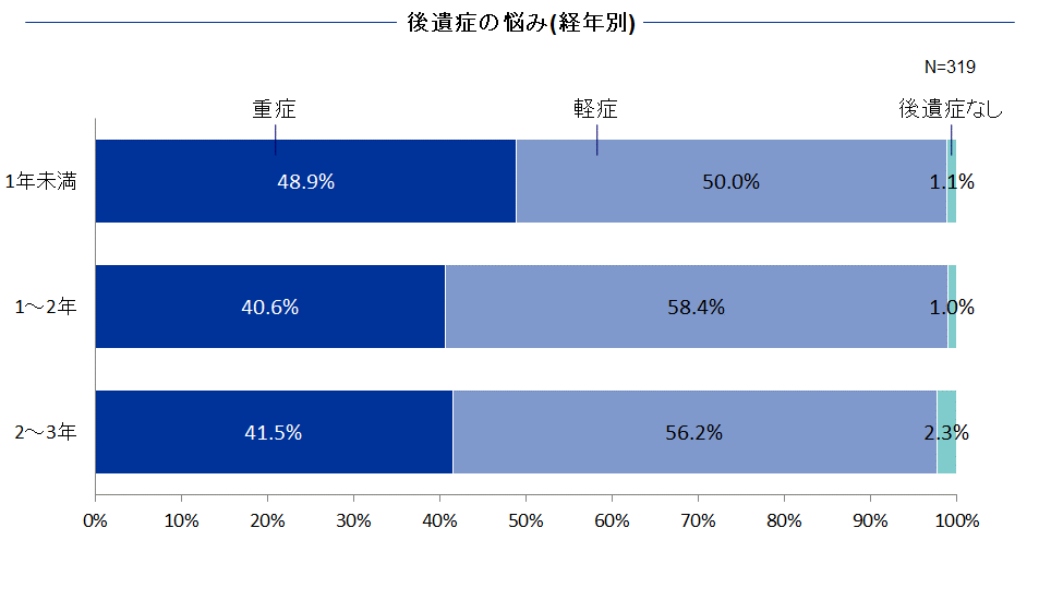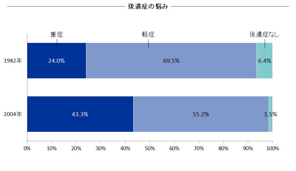 当時の後遺症の状況と2004年時のアンケート結果を、後遺症の有無と重症度で比較しました。1982年、2004年いずれの調査においても、術後、何らかの後遺症をもつ人は、全体の9割以上を占めています。さらに驚くべきことに、「重症」と回答した方の割合は2004年のほうが高率でした。